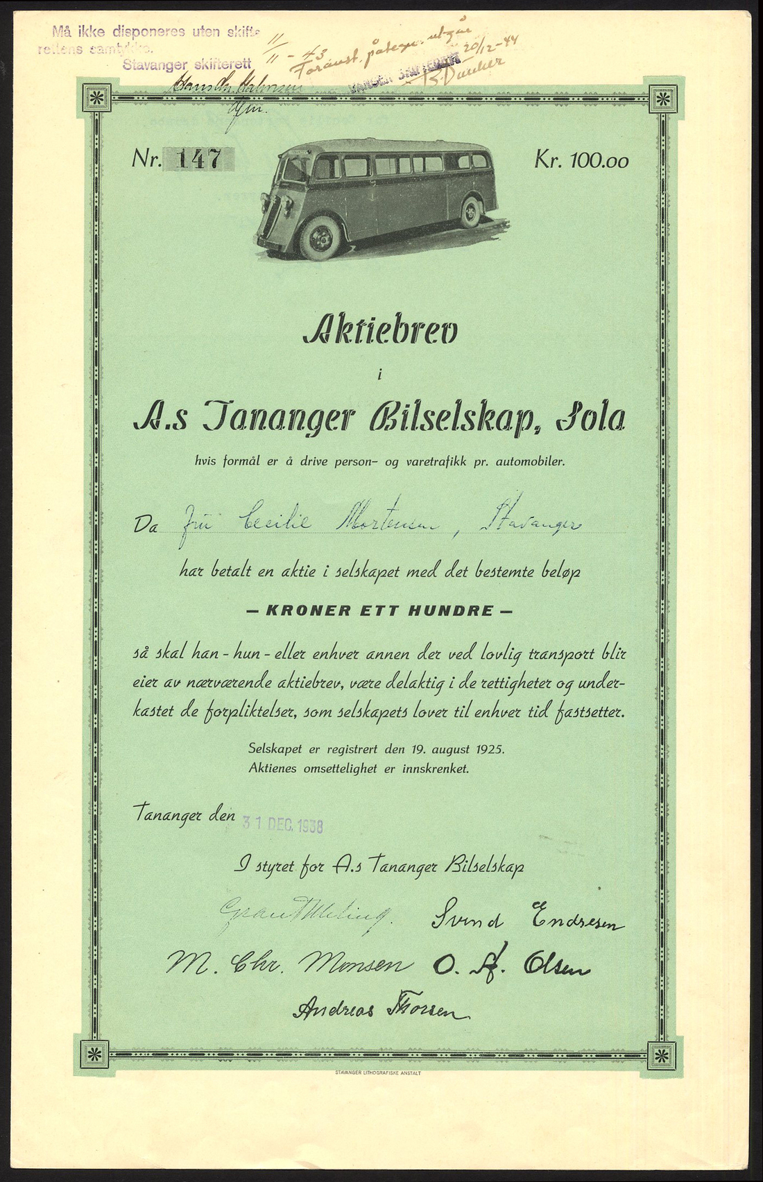 (x) Norway: Tananger Bilselskap, 100 krone share, Tananger [1938], no.147, Bus at top, ornate border, black with green underprint, extremely fine.