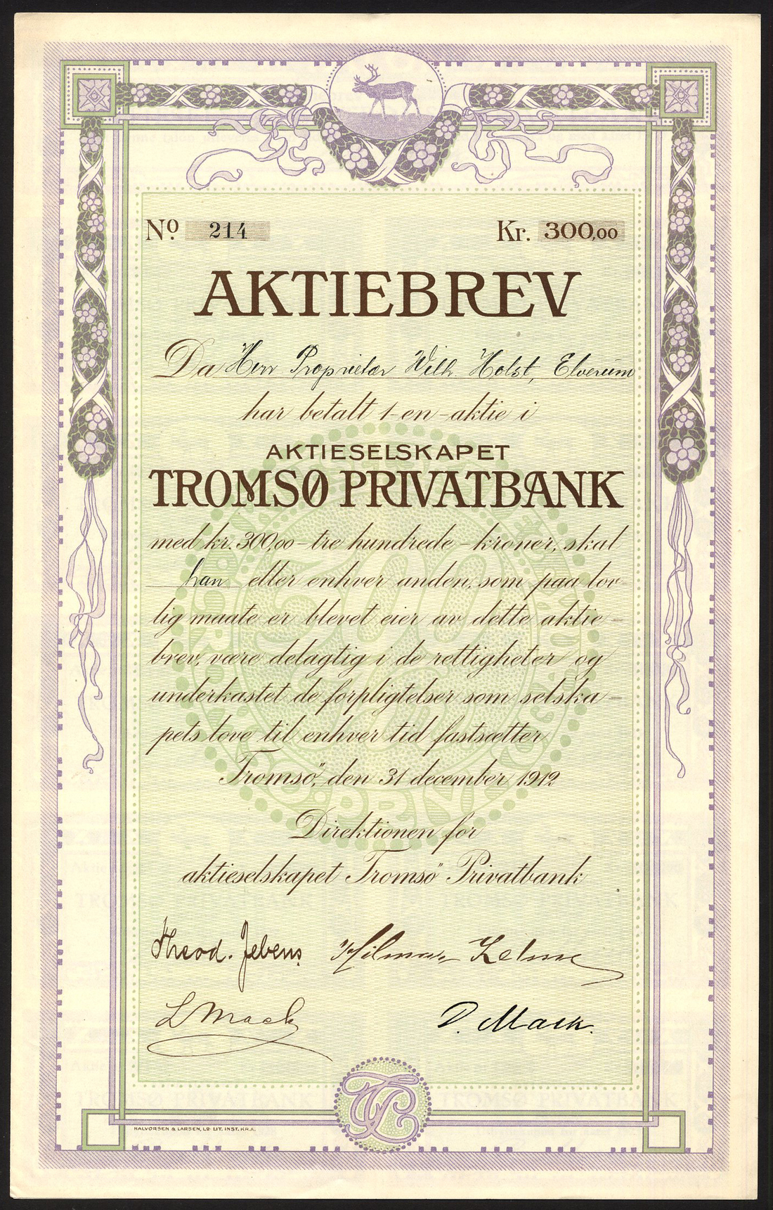 (x) Norway: Tromsø Privatbank, 300 krone share, Tromso 1912, no.214, ornate border, underprinted '300 Kr', brown, lilac and green, with coupons, extremely fine.