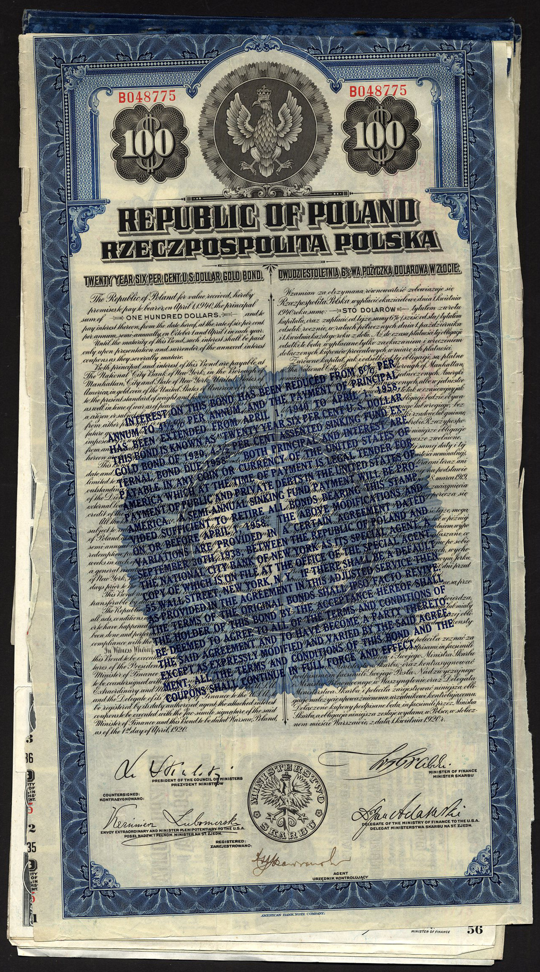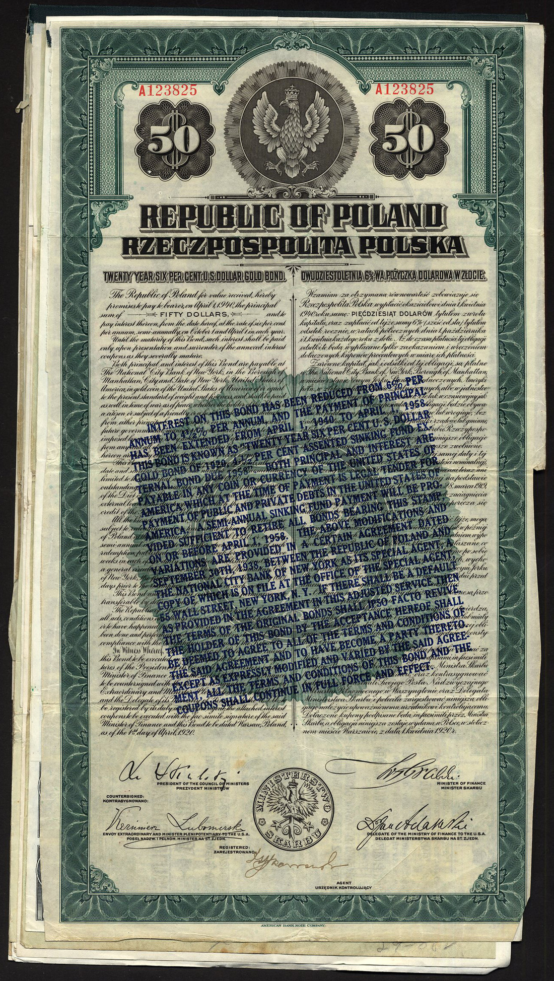 Republic of Poland: 20-Year 6% Gold Loan of 1920, a group of bonds for $50 (6) and $100 (7) crowned eagle at top, ornate border, text in English and Polish, blue and green respectively, blue overprint of reduced interest and extended terms, 1938, with coupons, mixed condition but many very fine. (13)