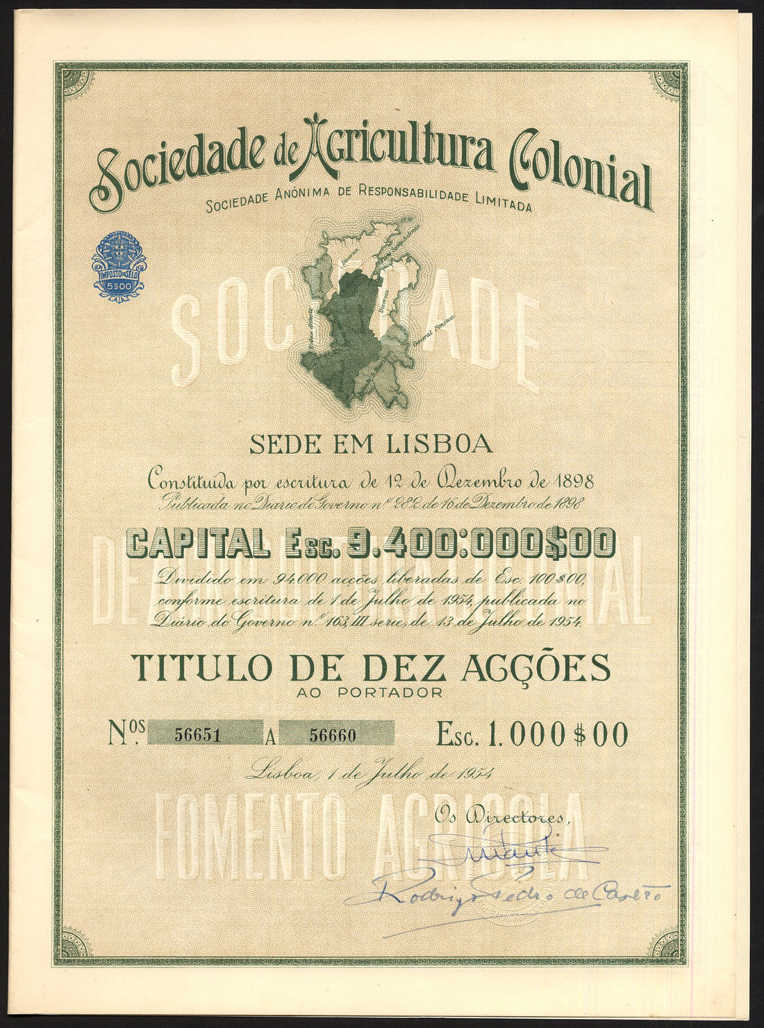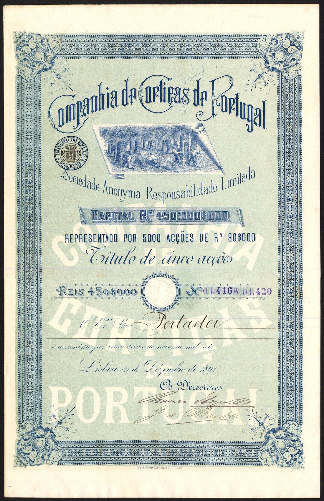 Portugal: Companhia de Corticas de Portugal, a group of 5 certificates for 5 shares of 90 reis each, Lisbon 1891, very attractive pieces with vignettes of tree cutting, blue; together with 10 certificates of the Sociedade de Agricultura Colonial, Sao Tome and Principe, each for 10 shares, 1954, map of the Island at top, brown and green, with coupons, extremely fine. (15)