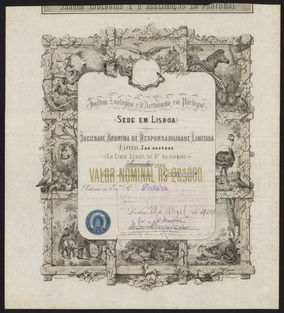 Portugal: Jardin Zoologico e d'Acclimacao em Portugal, 20$000 share, second series, 188[904], no.731, beautiful design with lion, zebra, ostrich, elephant and other animals around border, black, extremely fine.