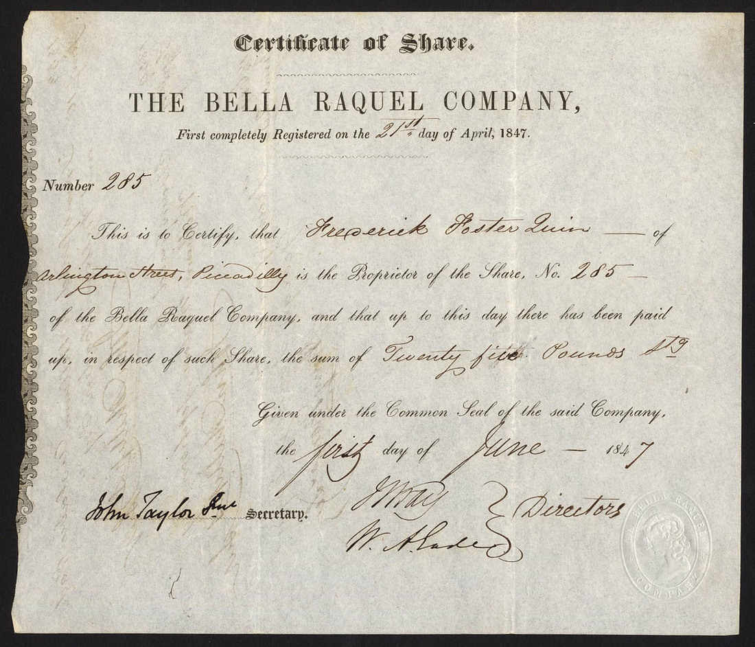 Spain: Bella Raquel Company, share, 184[7], no.285, signed by John Taylor Jnr as secretary, thin ornate border at left, black printing, embossed seal depicting 'Bella Raquel' bottom right, transfers on reverse, good very fine.