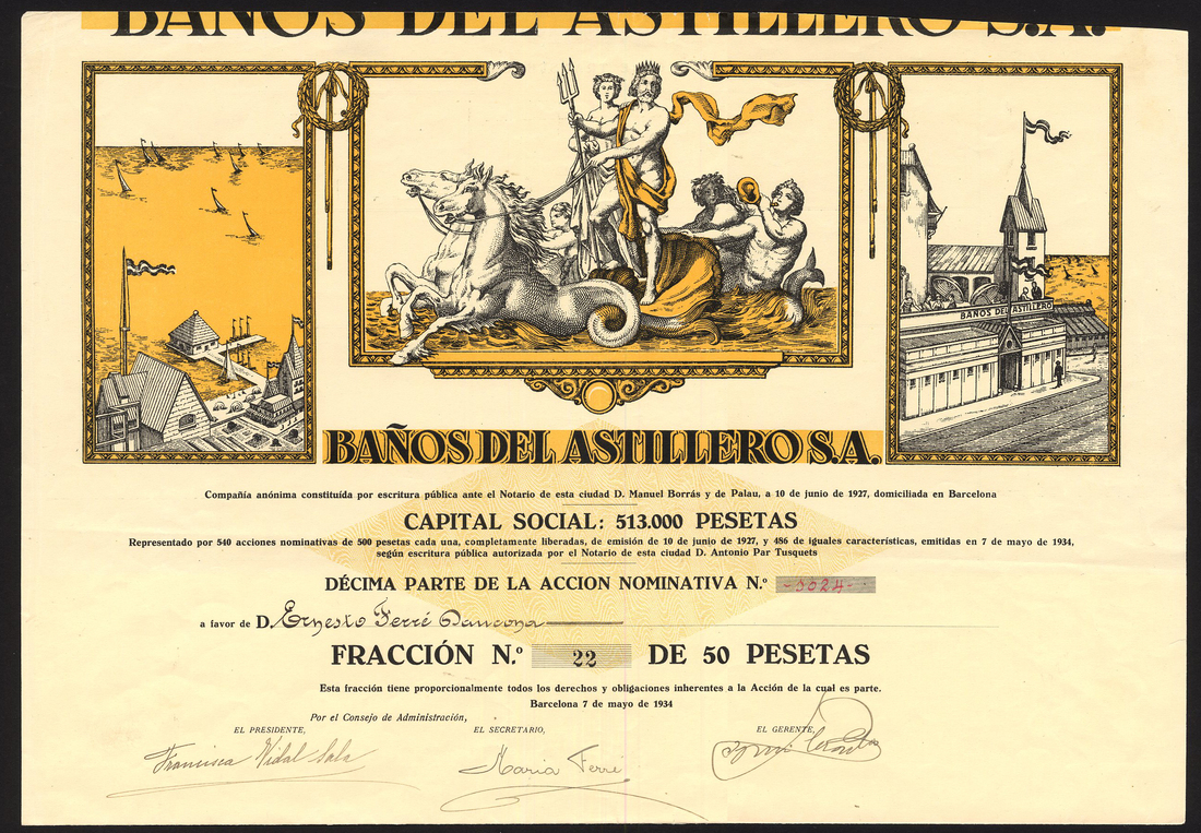 Spain: Baños del Astillero S.A., part share of 50 Pesetas, Barcelona 1934, no.22, large vignettes at top depicting Poseidon and Amphitrite in centre, Shipyard to the left, and company premises to right, black and yellow, good very fine.