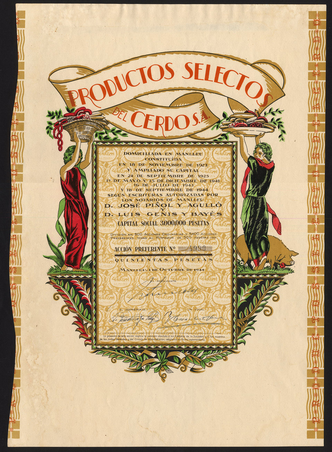Spain: Productos Selectos del Cerdo S.A., 500 Peseta share, Manlleu 1944, no.4990, colourful piece with allegorical figures to left and right, depicted with full basket, platter and pig, black, red, green and gold, faint water damage to top and bottom edge, about very fine.