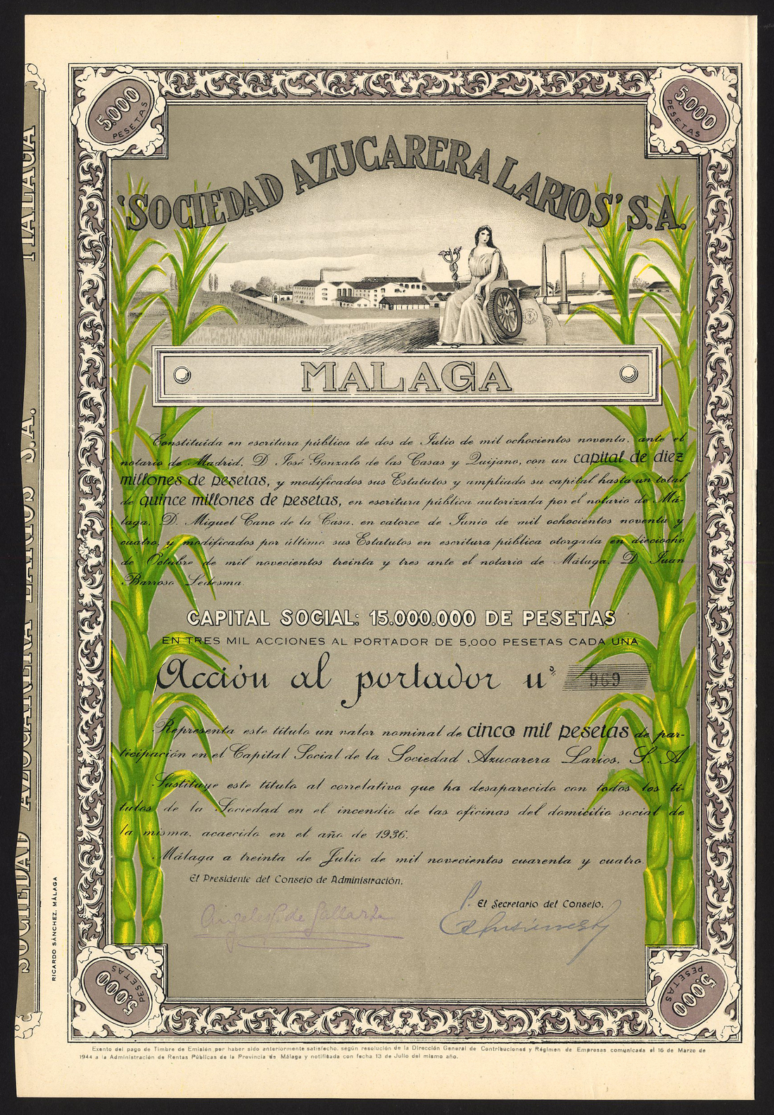 Spain: 'Sociedad Azucarera Larios' S.A., 5000 Peseta share, Malaga 1944, no.969, attractive piece with allegorical female in front of sugar refinery at top, large green sugar canes either side, and ornate border, black and green, with coupons, extremely fine.