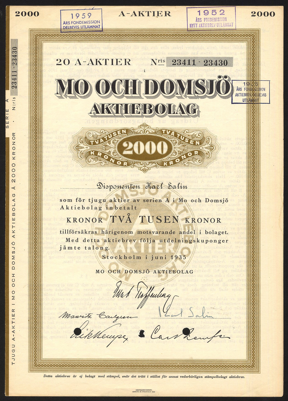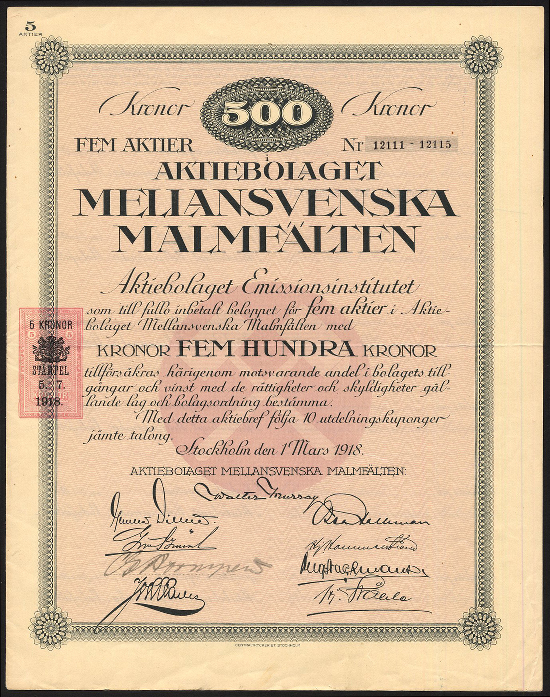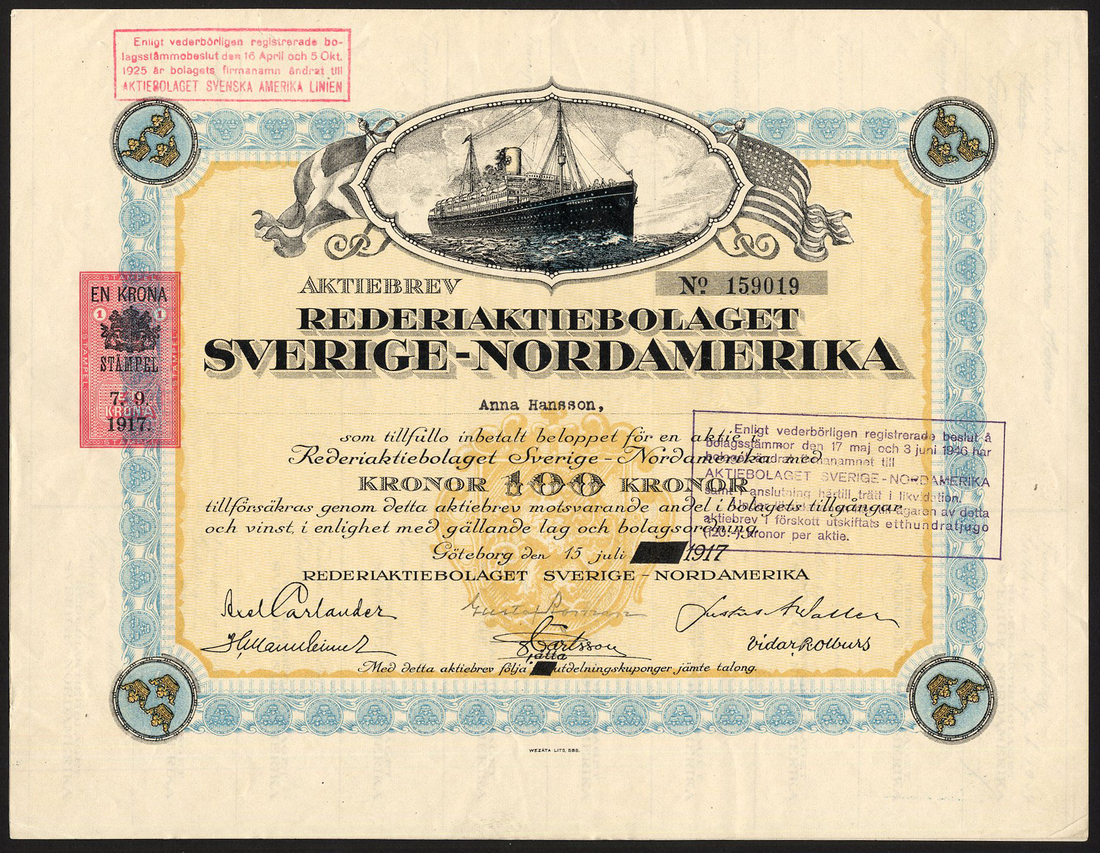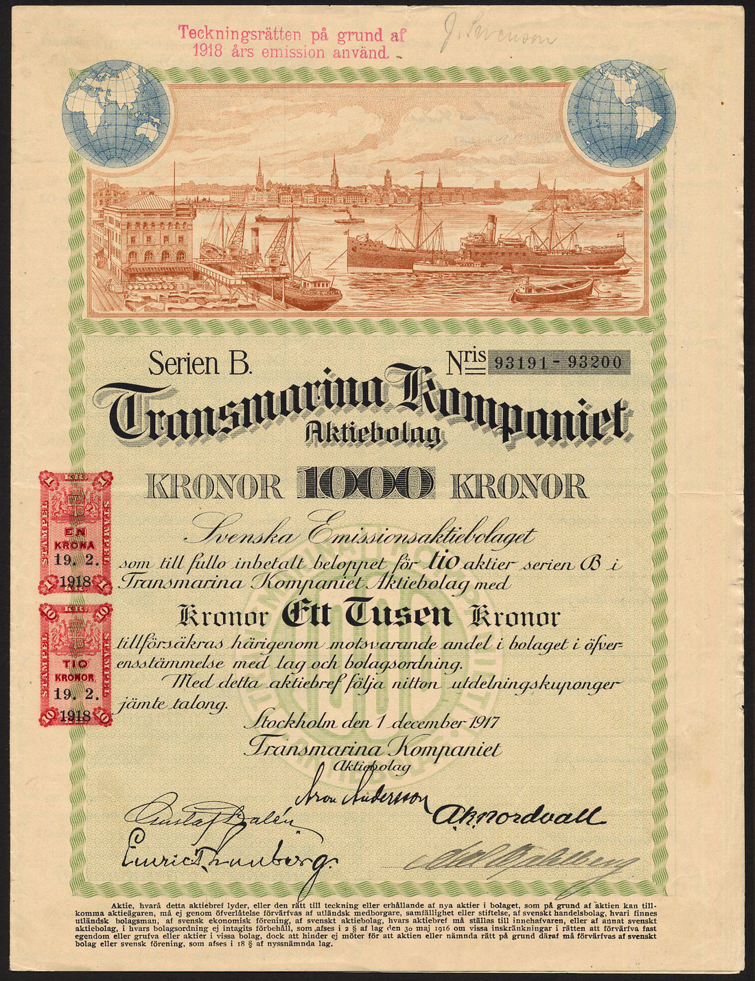 Sweden: AB Garbo-Fakir, Stockholm, an unissued certificate for 100 kroner, 1933, company logo of the side face sketch of actress Greta Garbo, red; together with Järnvägstransport Forsakrings AB, 100 kroner, 1918; Oxelosunds Jarnverks AB, 1000 kroner, 1914; Rederiaktiebolaget Sverige-Nordamerika, 100 kroner, 1917, small tear at top edge; Transmarina Kompaniet AB, 1000 kroner, 1917; Mellansvenska Malmfalten, 100 and 500 kroner, both 1918, and, Mo Och Domsjo AB, 2000 kroner, 1935, 1000 kroner, 1955, 100 and 500 kroner, both 1959, very fine to extremely fine. (11)
