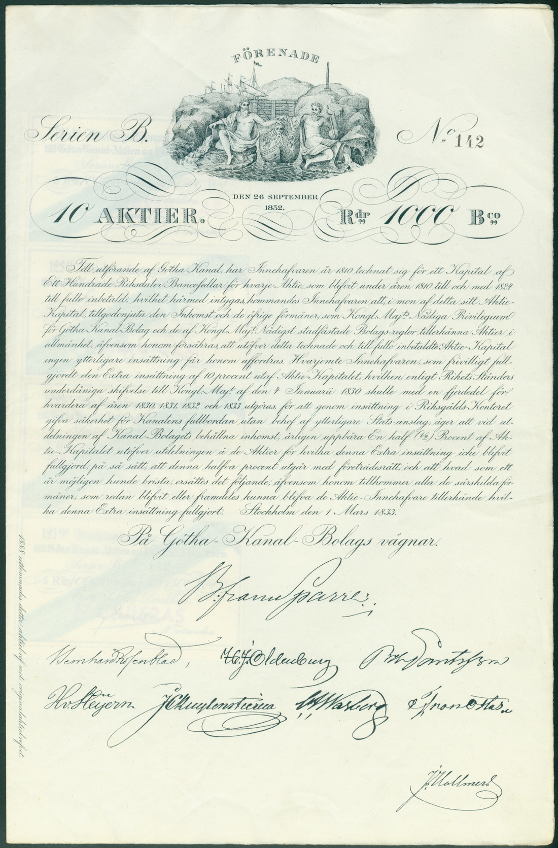 Sweden: Götha-Kanal-Bolags, Stockholm, 10 shares of 100 riksdaler, series B, 1833 (1888 replacement certificate), no. 142, stylised vignette of canal barge, allegorical figures before lock gate, black, with coupons, extremely fine.