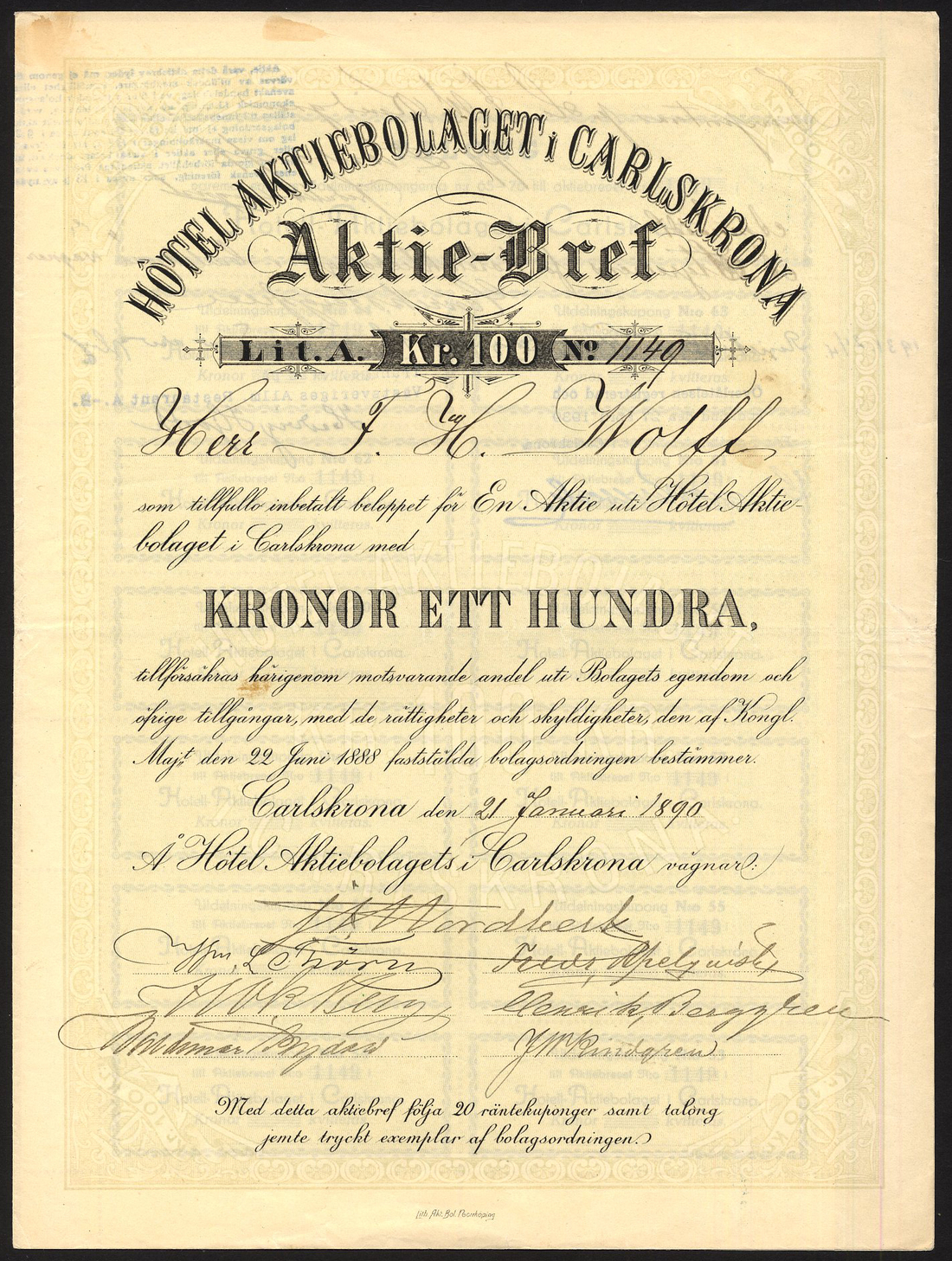 Sweden: Hotel Aktiebolaget Carlskrona, 100 kroner share, [1890], no.1149, black, green underprint, with coupons; together with other Swedish certificates comprising Wisby Kakelfabriksaktiebolag, 100 kroner, 1917; Aktiebolaget Forsberg & Persson, 100 kroner, 1917; Ousby Yllefabriks AB, 200 kroner, 1918; Aktiebolaget Cyanid, 500 kroner, 1915; Aktiebolaget Asklunds Yllefabrik, 100 kroner, 1941; Luth & Rosens Elektriska AB, 100 kroner, 1920; Nya Forsakringsaktiebolaget Hansa, 500 and 5000 kroner, both 1917, and, an unissued but signed certificate of Osterdalarnes Angbats AB, 100 kroner, 1900, generally very fine to extremely fine. (10)