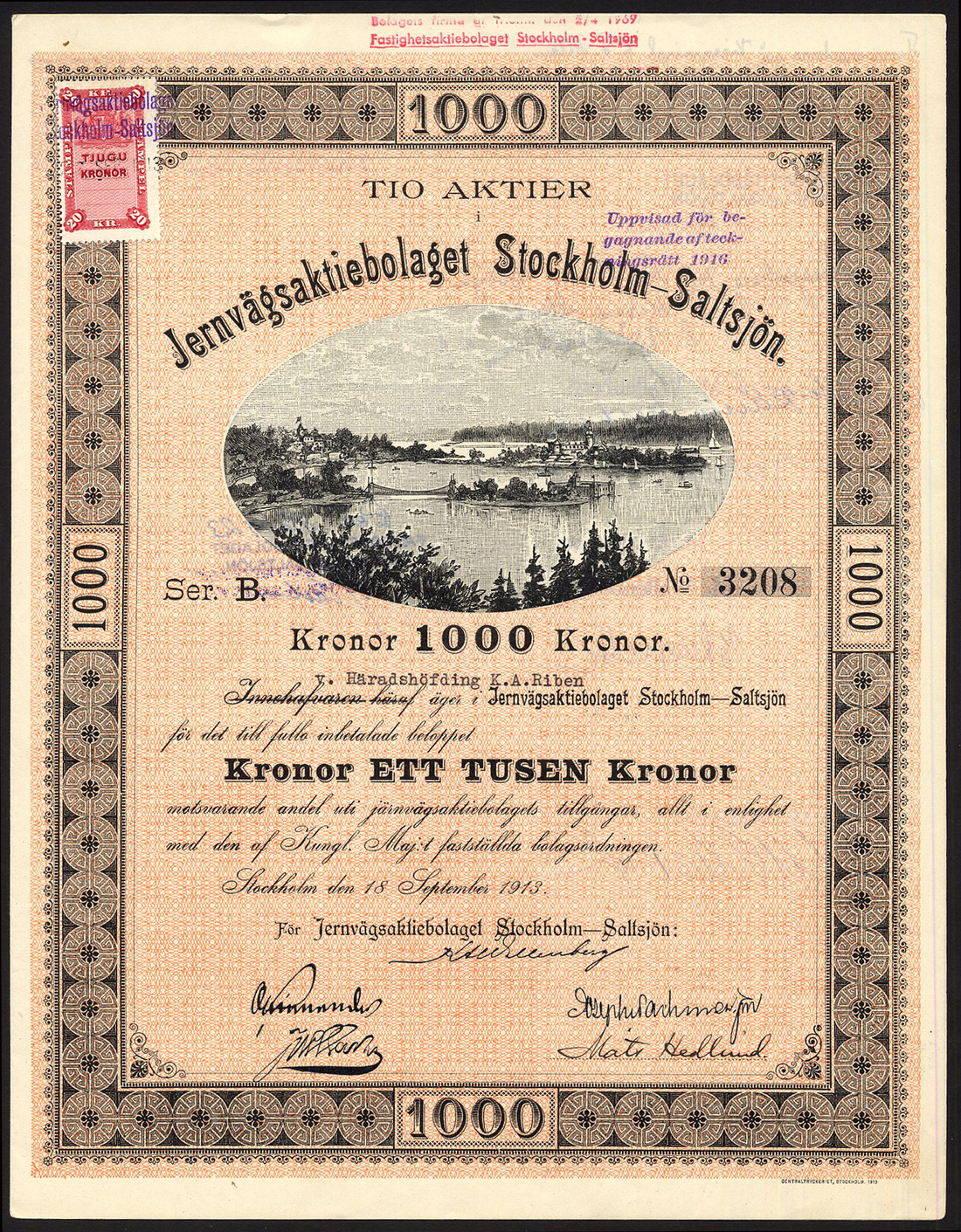 Sweden: Jernvägsaktiebolaget Stockholm -Satsjön, 1000 kroner share, Stockholm 1913, no.3208 series B, large vignette of bay with islands, bridges and castles, ornate border, black, pink underprint, with coupons, extremely fine.