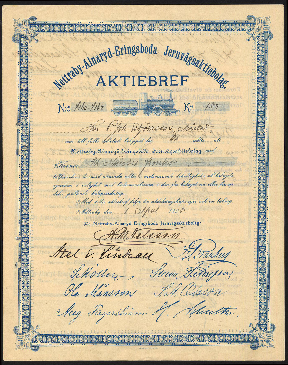 (x) Sweden: Nettraby-Alnaryd-Eringsboda Jernvägsaktiebolag, 150 krona share, 190[5], no.4160-4162, ornate border and steam engine at top, blue, with coupons, small nick to bottom edge, otherwise good very fine.