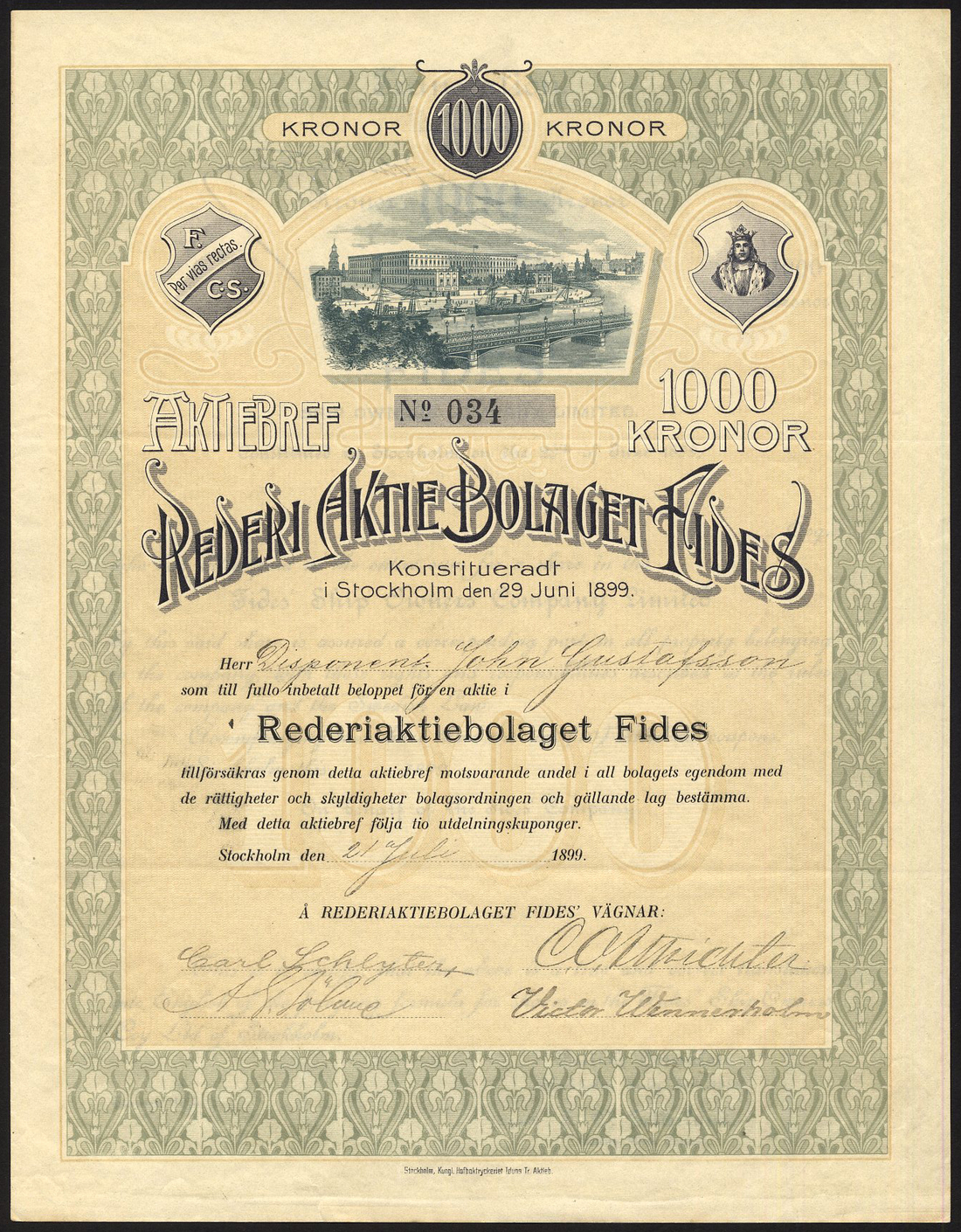 Sweden: Rederi Aktie Bolaget Fides, 1000 kroner share, Stockholm 1899, no.034, Government building and river scene and steamboat, company logo to left and King to right, green and yellow, with coupons, extremely fine.