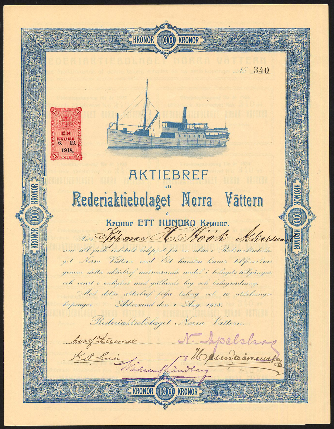 (x) Sweden: Rederiaktiebolaget Norra Vättern, 100 krona share, Askersund 1918, no.340, steam boat at top, ornate border, blue, with coupons, extremely fine.