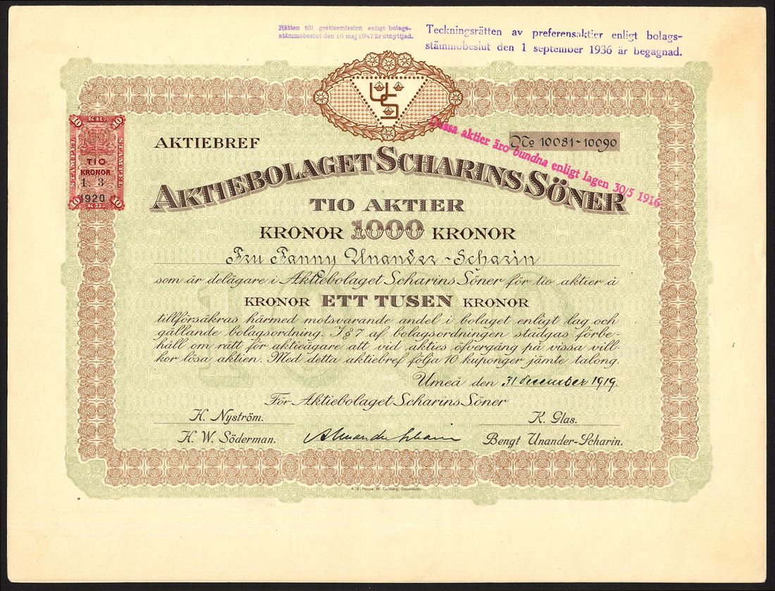 (x) Sweden: Scharins Söner, 10 shares or 1,000 krona share, [1919], no.10081-90, ornate border, brown with green underprint, extremely fine.