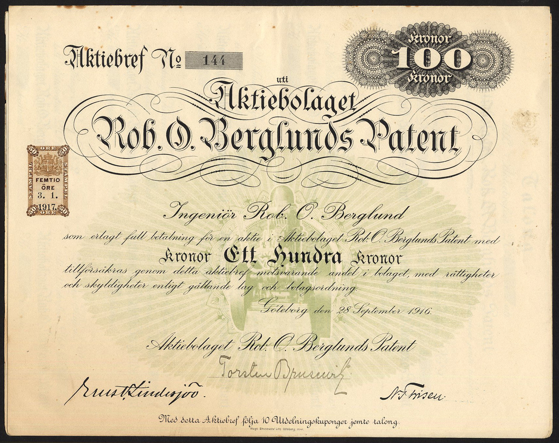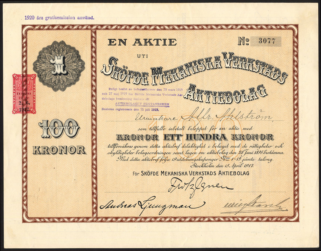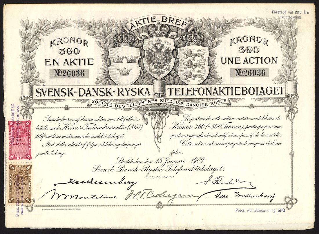 Sweden: Svenska-Dansk-Ryska Telefonaktiebolaget, 360 kroner share, 1909, coats of arms of Sweden, Denmark and Russia at top, together with; Forvaltningsaktiebolaget Agal, 5000 kroner, 1929; AB Gerda Flyren & C:o, Gargeri, Kemisk Tvatt-och Strykinrattning, 100 kroner, 1933; Elektrofirman Magnet Weimman & C:o AB, 100 kroner, 1936; AB Rob O. Berglunds Patent, 100 kroner, 1916; Sigge Bjorck's Konsthandel AB, 1000 kroner, 1919; Skofde Mekaniska Verkstads AB, 100 kroner, 1917, and, Aktiebolaget Fettindustri, 100 and 500 kroner, 1918, very fine to extremely fine. (9)