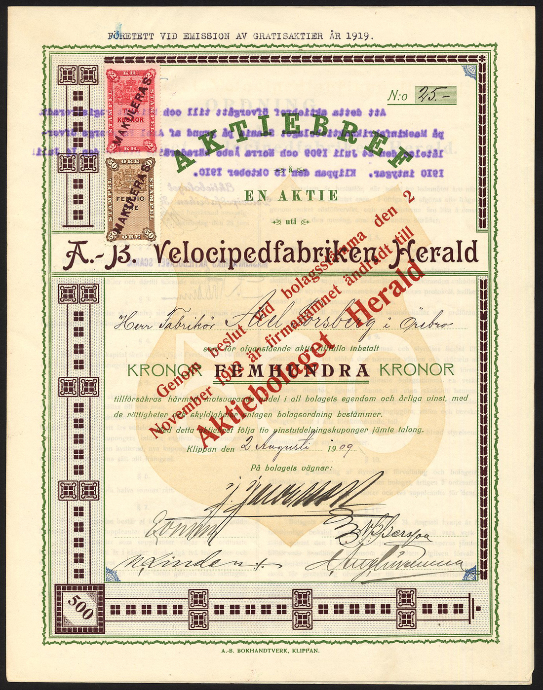 (x) Sweden: Velocipedfabriken Herald, 500 kroner share, Klippan 19[09], no.25, ornate border, 4 pages, brown and green, with printed endorsement with change of company name to Aktoebolaget Herald in 1912, almost extremely fine.