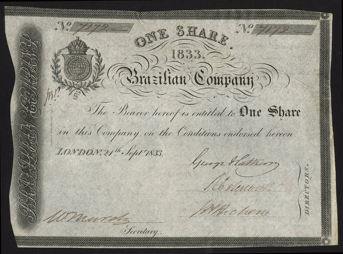Brazil: Brazilian Company, certificate for one share, London 1833, #7172, coat of arms top left, black printing on vellum, instalments shown on reverse with printed conditions, extremely fine and rare. [R9]