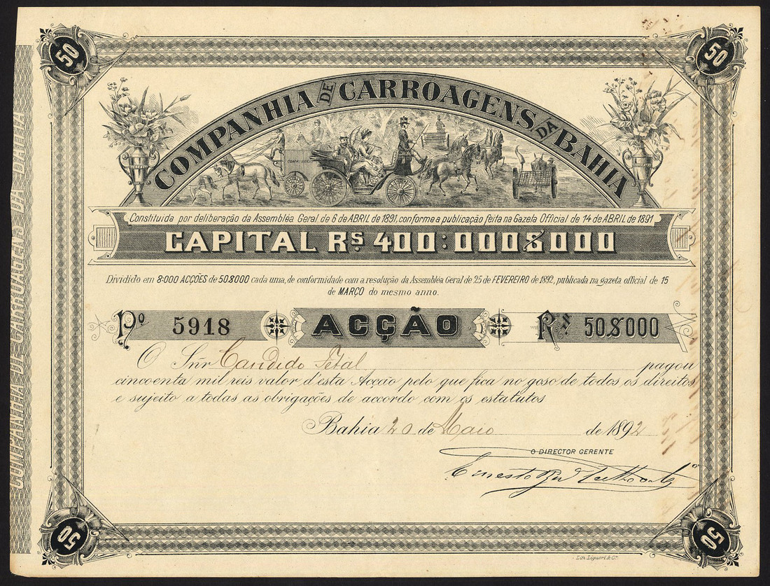 Brazil: Companhia de Carroagens da Bahia, 50 milreis share, Bahia 189[2], no.5918, lovely vignette of horse and carriage and other types of wagon, black, extremely fine.