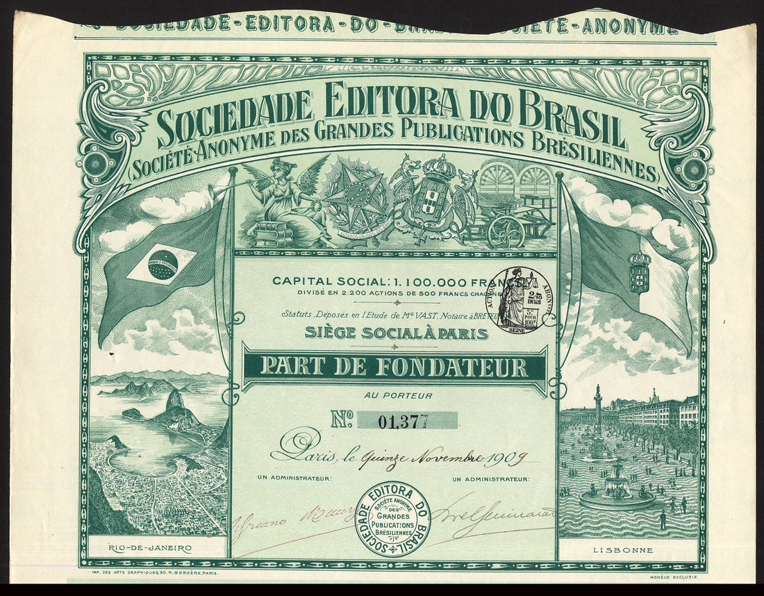 Brazil: Sociedade Editora do Brasil, founders share for 500 francs, Paris 190[9], no.01377, vignettes of Rio-de-Janeiro and Lisbon at either side, green, with coupons, small spike hole to left side, otherwise extremely fine.