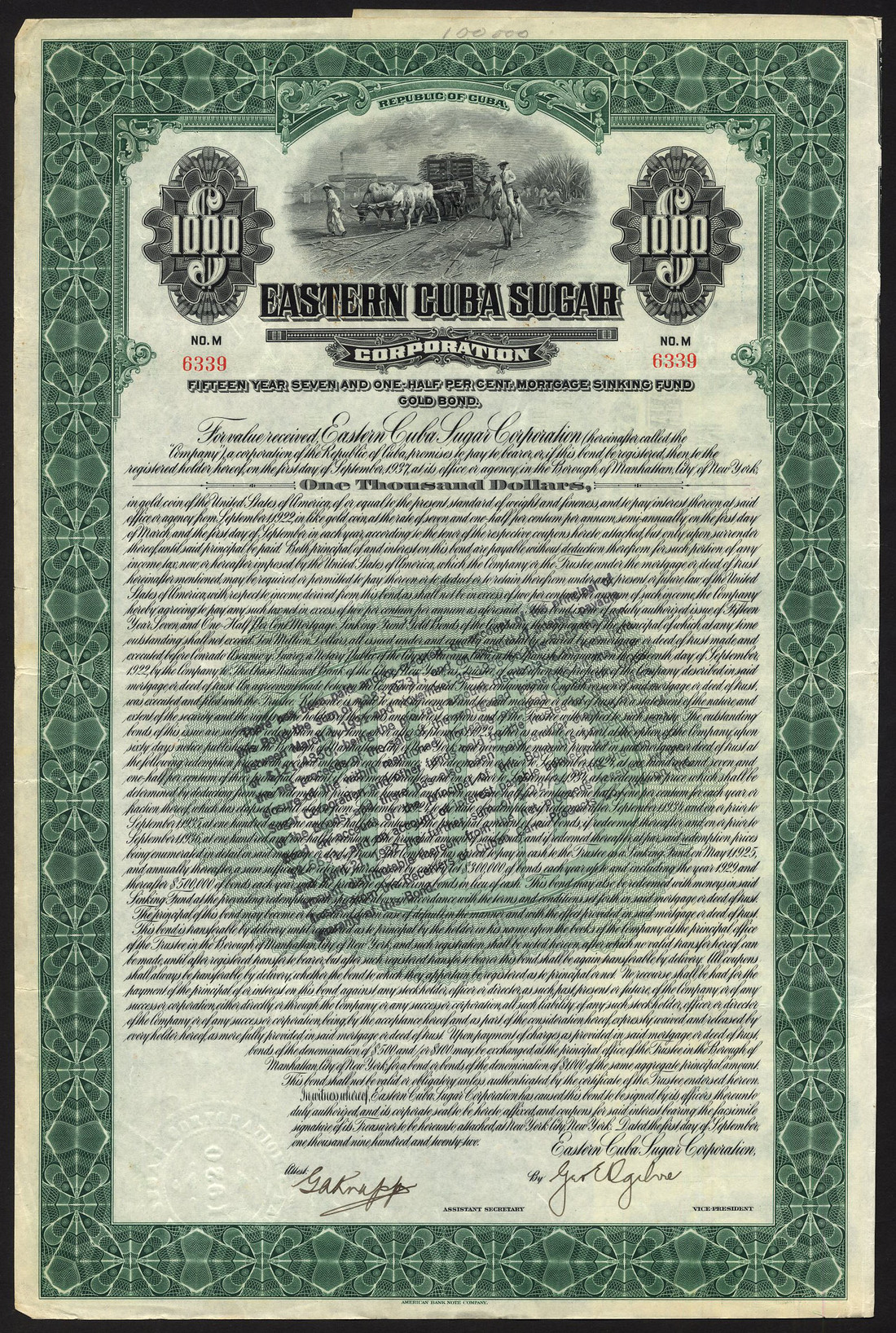 Cuba: Eastern Cuba Sugar Corporation, 15-Year 7½% Mortgage Gold Loan, 1922, a group of 8 bonds for $1000, cane fields and loaded wagon with oxen, green and black, with coupons, fine to very fine. (8)