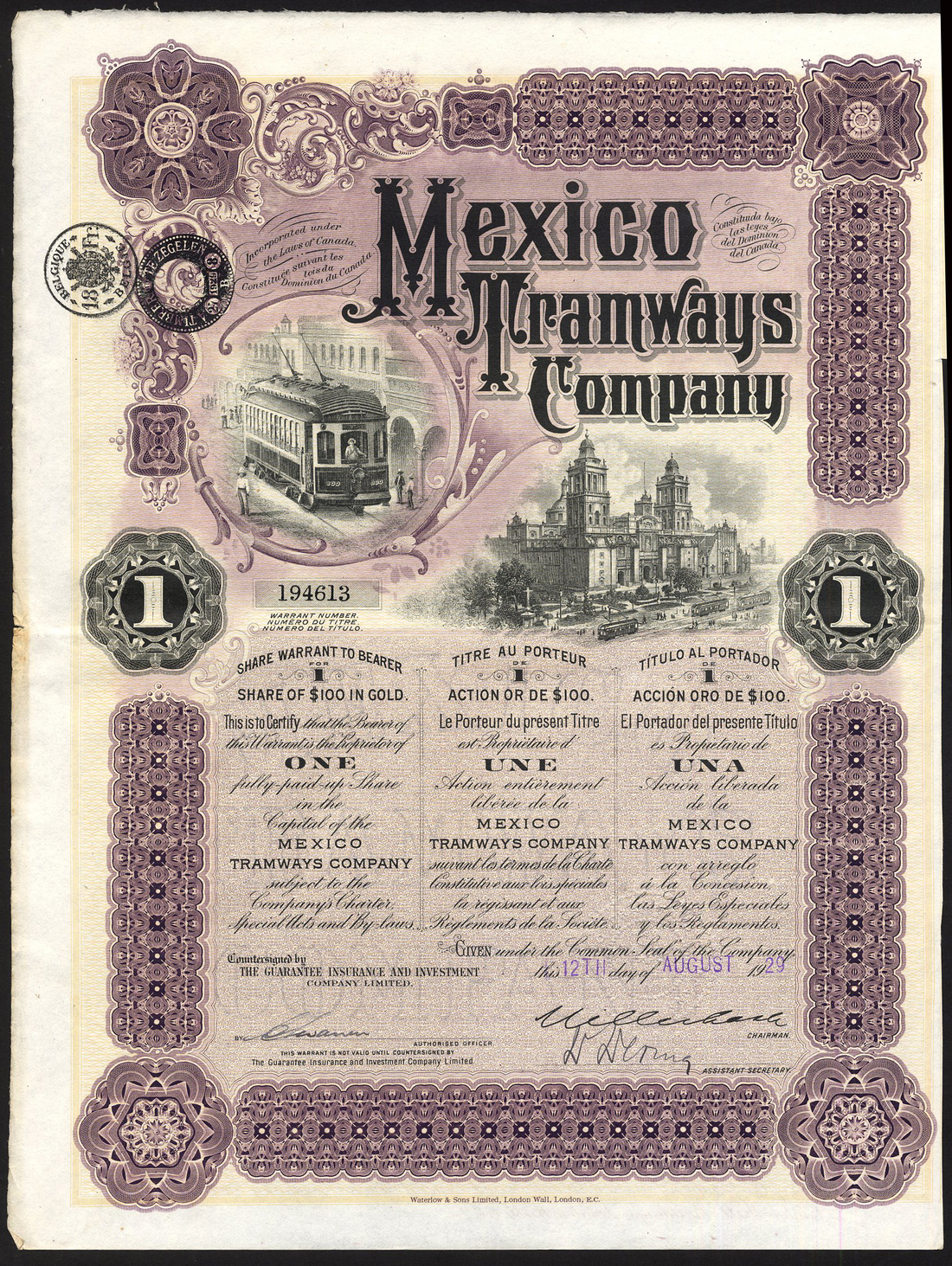 Mexico: Mexico Tramways Company, a group of share warrants for one share of $100, 19[29], numbers 194613 through 194617, attractive pieces printed by Waterlow & Sons with electric tram top left, Government building to right, mauve and black, with coupons, all about extremely fine. (5)
