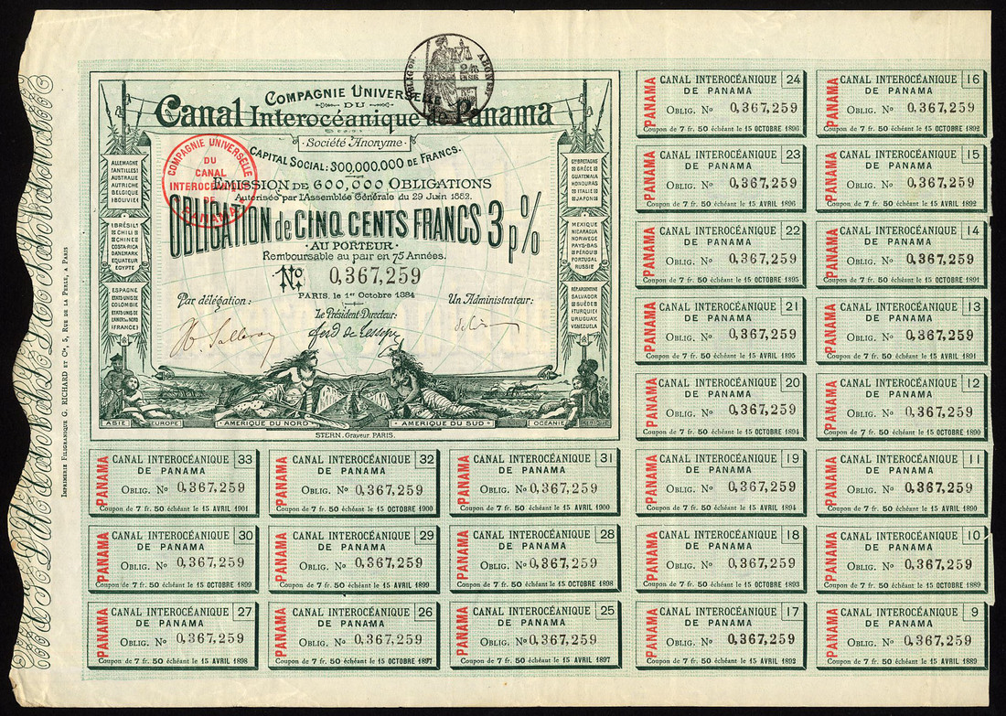 Panama: Compagnie Universelle du Canal Interocéanique de Panama, 3% bond, Paris 1884, a group of 9 certificates, standard format of respesentations of North and South America joining hands across the canal, green, with coupons, three with some creases otherwise very fine to good very fine. (9)