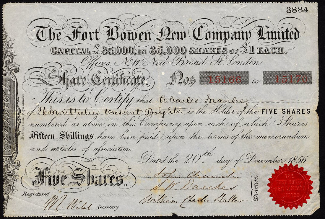 Venezuela/Panama: Fort Bowen New Company Ltd., 5 shares of £1, 15 shillings paid, 1856, black printing, red seal, fine to very fine and scarce. (4)