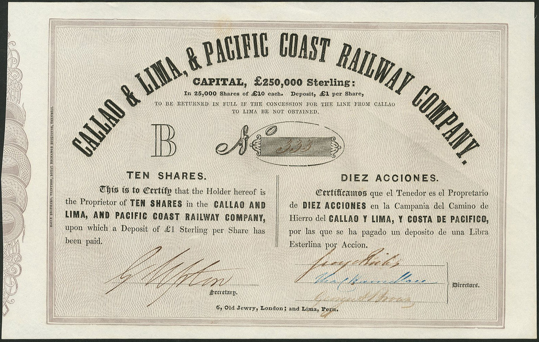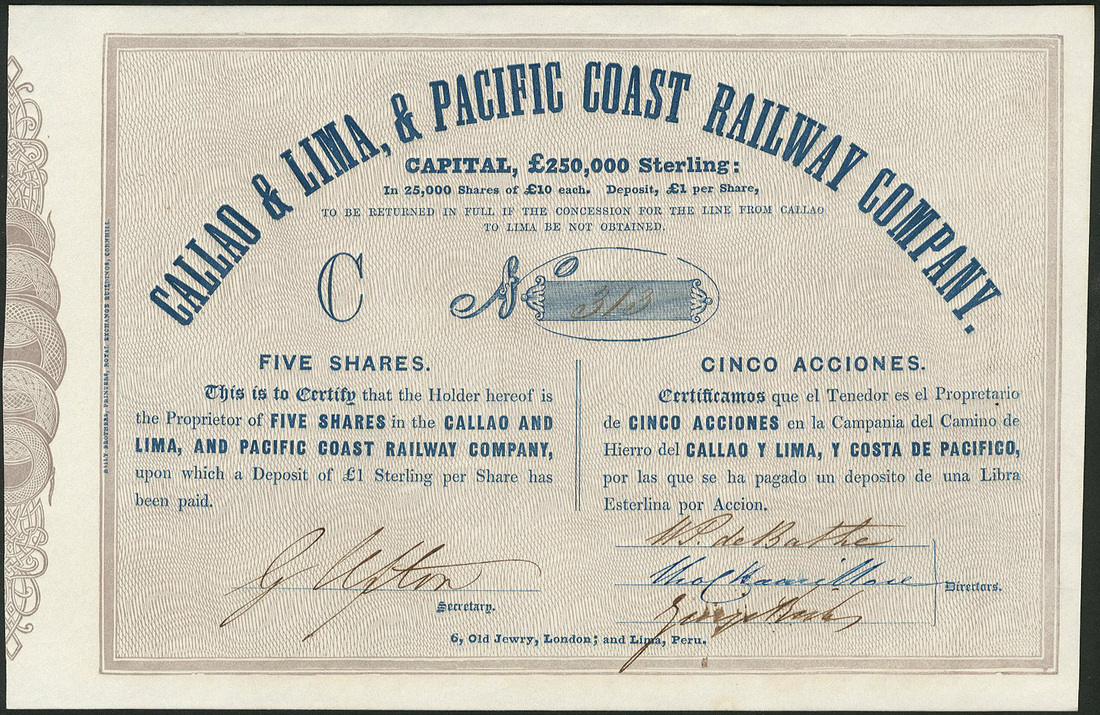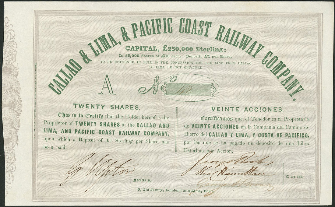 Peru: Callao & Lima, & Pacific Coast Railway Co., a set of three certificates for 20, 10 and 5 shares of £10 each, £1 paid per share, no's.42, 333 and 313, not dated but circa 1845, scrollwork at left, green, black and blue respectively, all with mauve underprint, together with a miscellaneous collection of European and Colonial companies, many with duplication, mostly early 1900's including; Compagnie Immobilière de Dusseldorf, 100 franc share (5), Paris 1905, ornate border, red and blue; Compagnie Francaise des Chocolats et des Thés L. Schaal & Cie., 500 franc share (4), Strasbourg 1927, allegorical figures in centre, brown and yellow; Compagnie Générale des Tabacs, 100 franc preference share (7), Paris 1927, plantation at top and ornate border, blue; Societate Anonima Romana Pentru Desvoltarea Industrie Miniere, 10 shares of 500 lei each (3), Bucharest 1923, very ornate border of allegorical figures and mine workings, brown and black; Motocyclettes et Automobiles "Viratelle", 100 franc share (2), Lyon 1920; Société Immobilière de la Grande Plage d'Hyères, 100 franc share (2), 1927; Société des Plantes à Parfums de Madagascar, 100 franc share (9), 1927; La Kotto, 500 franc share, 1907, and others (25), listed items mostly good very fine, others very fine, a few with filing holes, many with light creasing. (61)
