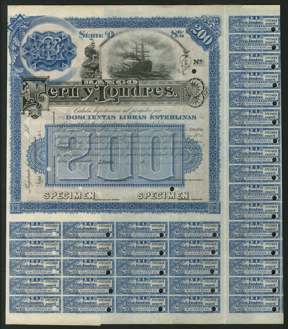 Peru: Banco Peru y Londres, a specimen 8% mortgage bond, series D, for P£200, circa 1900, from the Bradbury, Wilkinson & Co. archives, lovely vignette of steamships, allegorical figure to left, blue and black, with coupons, overstamped SPECIMEN, almost extremely fine.