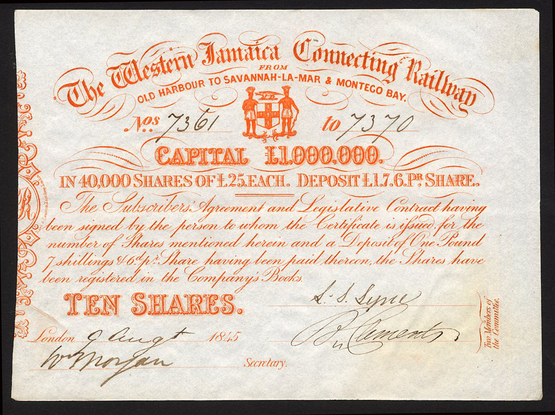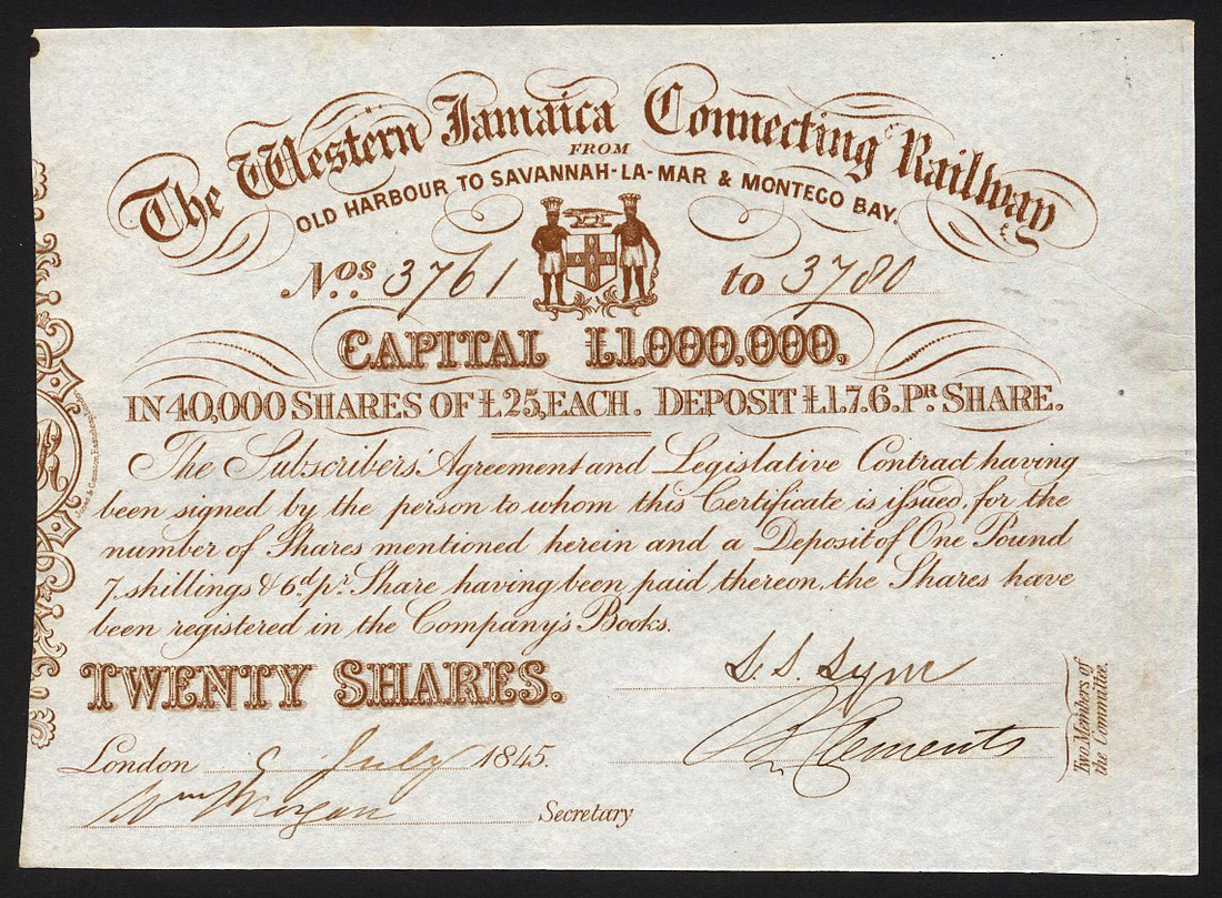 West Indies - Jamaica: Western Jamaica Connecting Railway from Old Harbour to Savannah-La-Mar & Montego Bay, pair of scrip certificates for 10 and 20 shares of £25, deposit of £1 7s 6d per share, London 1845, no.7361-70 and 3761-80, Jamaican coat of arms in centre, scrollwork left, orange and brown respectively, extremely fine. (2)