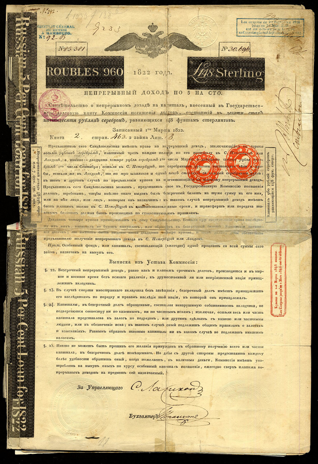 Russia: 1822, 5% 'Rothschild' loan, a group of bonds for 960 roubles or £148 (8), handsigned by Nathan Meyer Rothschild as Contractor, double headed eagle at top, black, on poor quality paper, with talons, mostly with some tape repairs, fair to fine. (8)