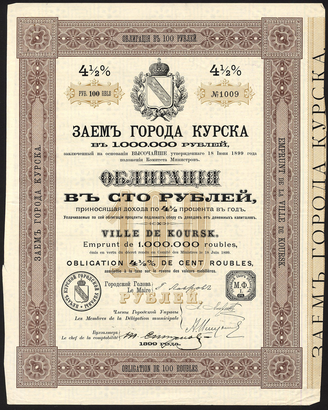 Russia: City of Koursk, 4½% Loan, 1899, bond for 100 roubles, no.1009, City arms at top, brown and black, with coupons, about extremely fine.