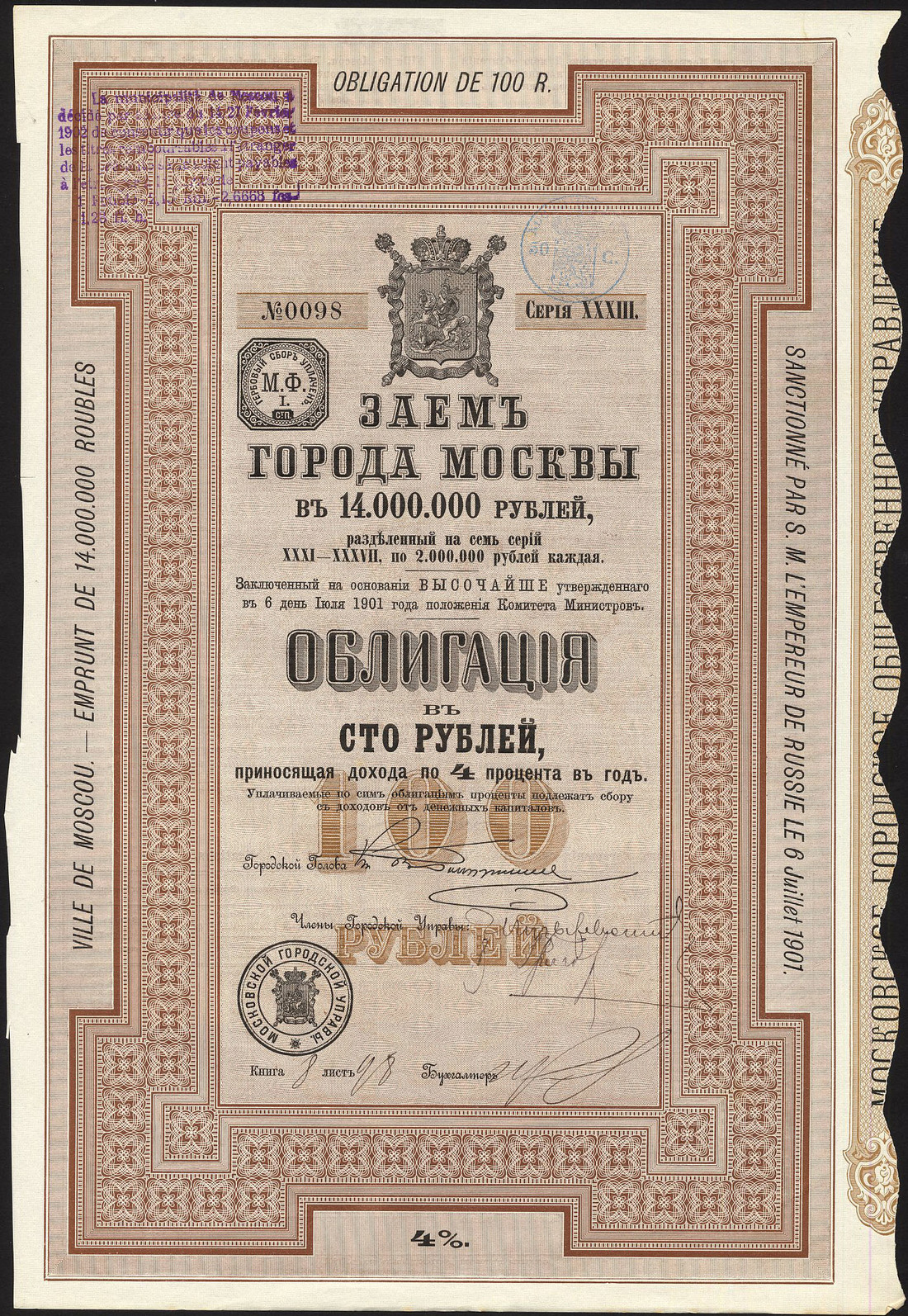 Russia: City of Moscow, a group of bonds comprising series XXXI, 100 and 500 roubles, series XXXII, 100 and 500 roubles. series XXXIII, 100 and 500 roubles, the last lacking coupons, series XXXVI, 500 roubles, this lacking coupons, and, series XXXIX, 500 roubles, all with city arms at top, brown and blue, with coupons unless stated, generally very fine and better. (8)