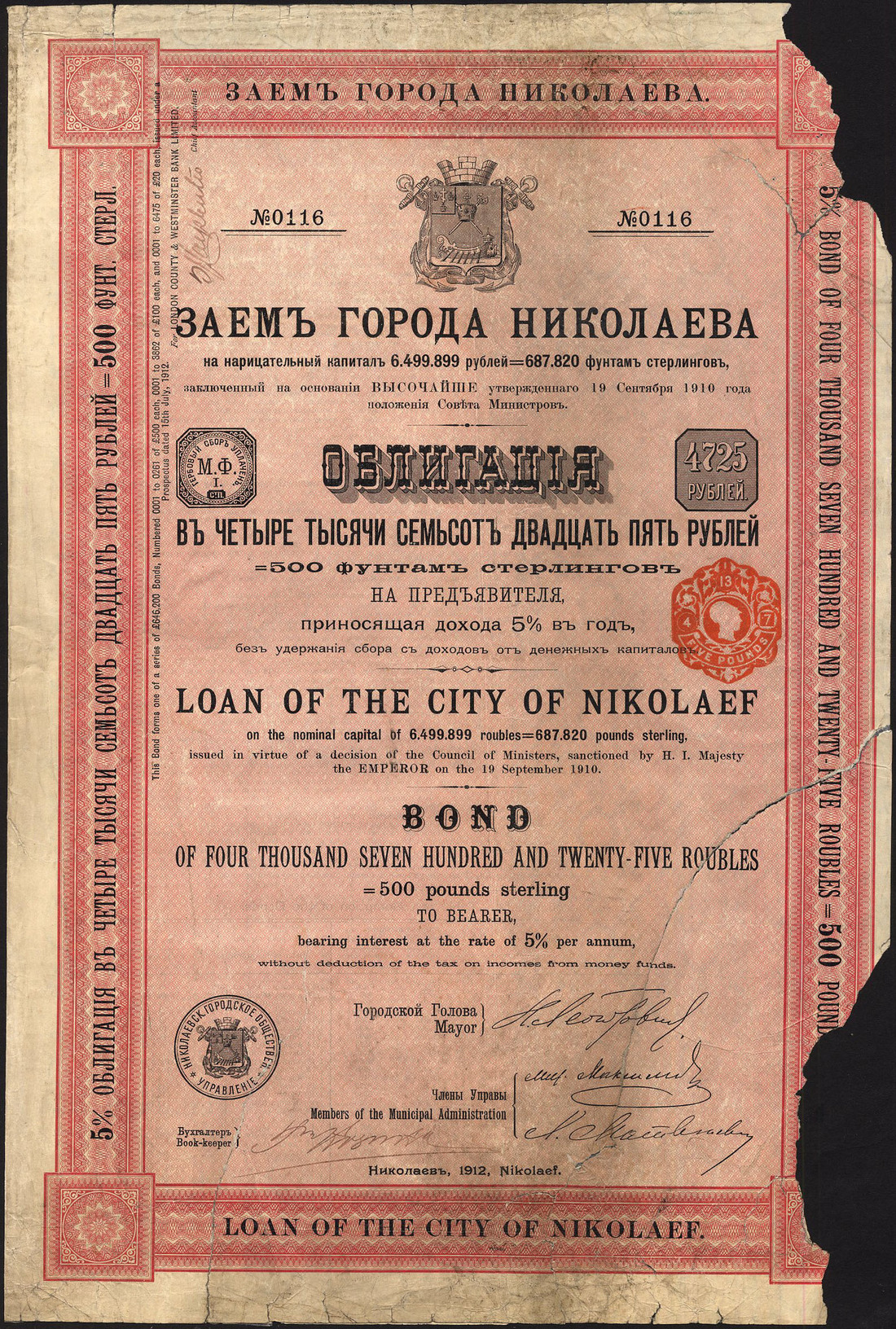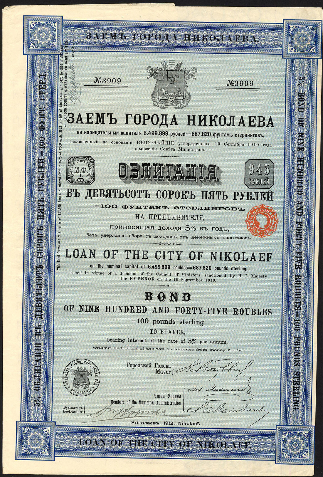 Russia: City of Nikolaef, 5% Loan, 1912, a group of bonds comprising 1st issue, £20, £100 and £500 and the scarcer second issue, £20 and £100, City arms at top, brown, blue and red, all with coupons, the £500 is poor condition with pieces missing at the right, the remainder are good very fine and better. (5)