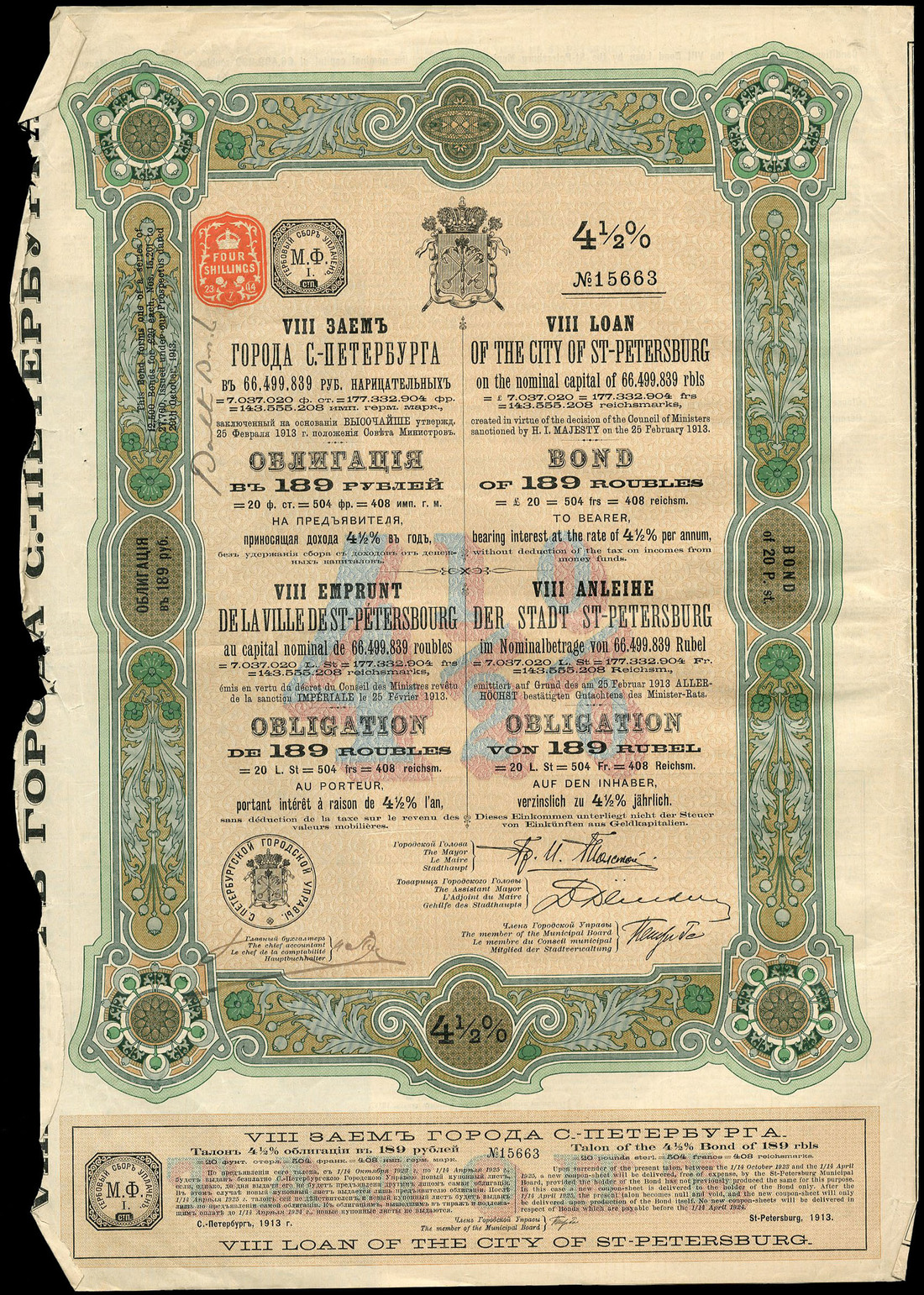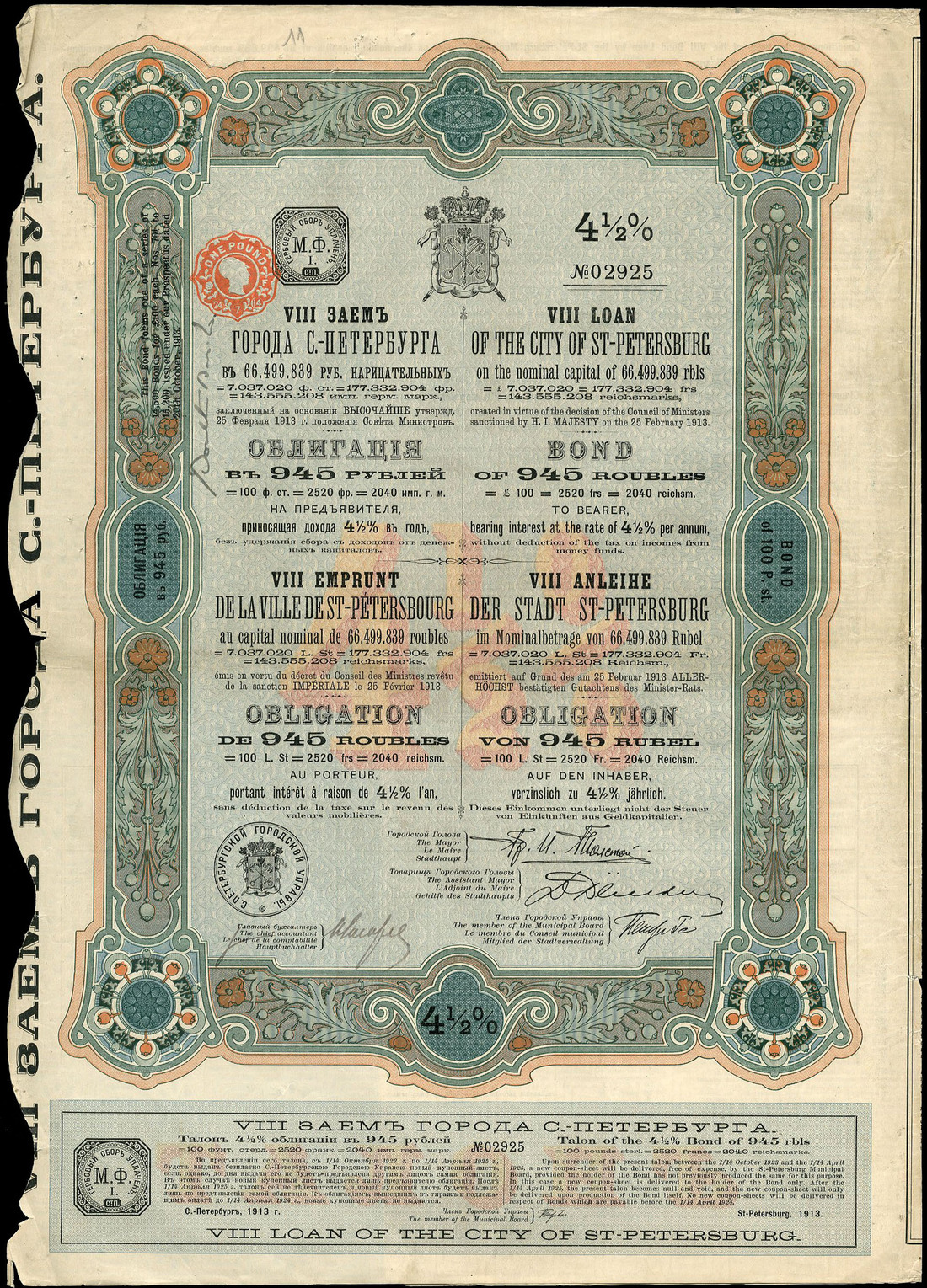 (x) Russia: City of St. Petersburg, 4.5% Loan, 1913, a group of 76 bonds for £20 (189 roubles) and 68 bonds for £100 (945 roubles), ornate borders, coat of arms at top, green, blue and beige, with coupons, some with edge tears but many very fine and extremely fine. (144)