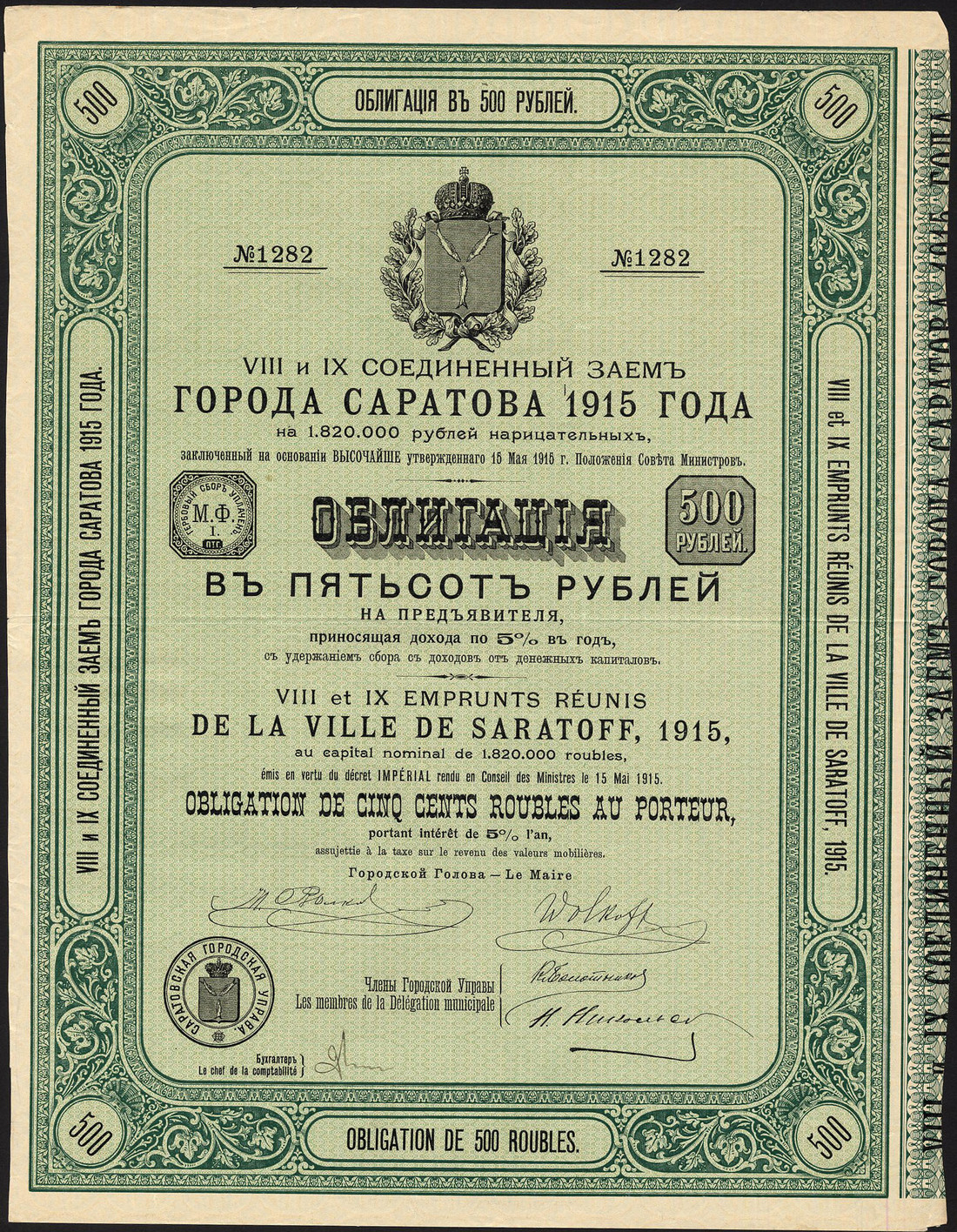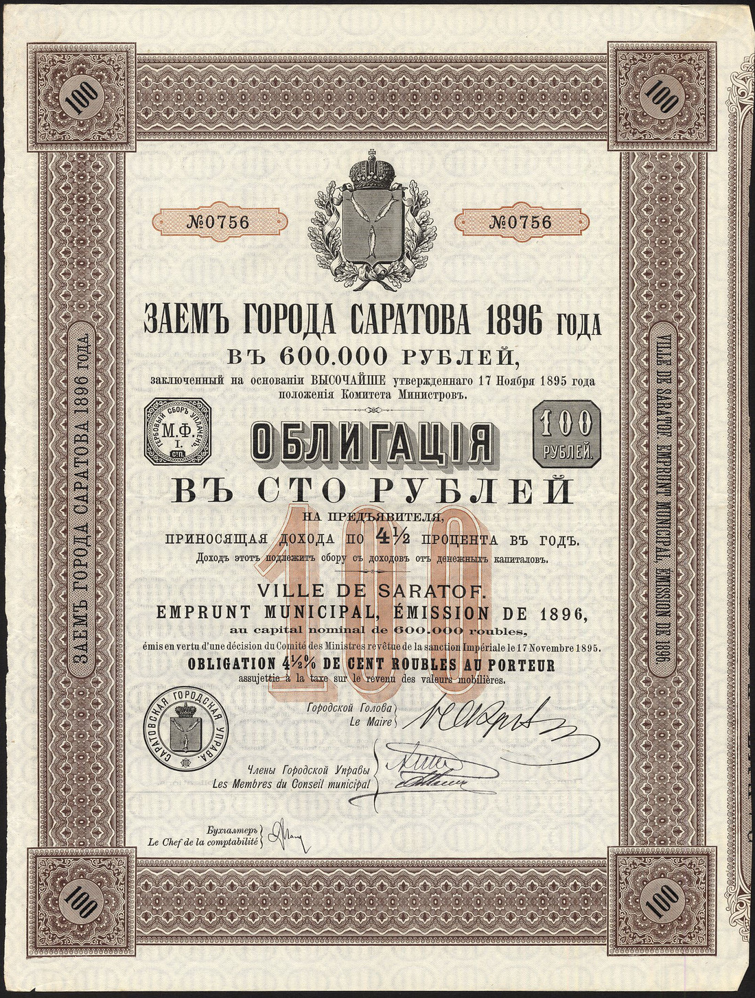 Russia: City of Saratoff, a group of bonds comprising 1896, 100 roubles, 1909, 937.50 roubles and 1915, 500 roubles, all with city arms at top, brown, mauve and green respectively, the first and third lack coupons, very fine and better (3)