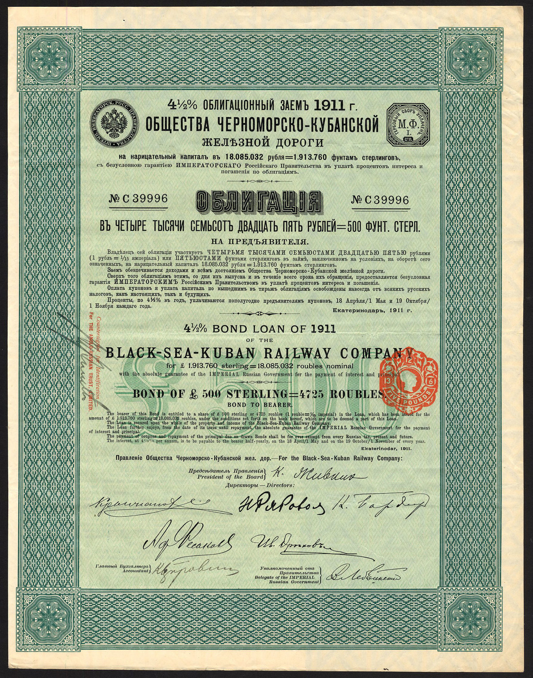 Russia: Black-Sea-Kuban Railway Company 4½% Loan, 1911, bond for £500, no.C39996, of only 400 issued, ornate border, green, text in English and Russian, with coupons, good very fine.