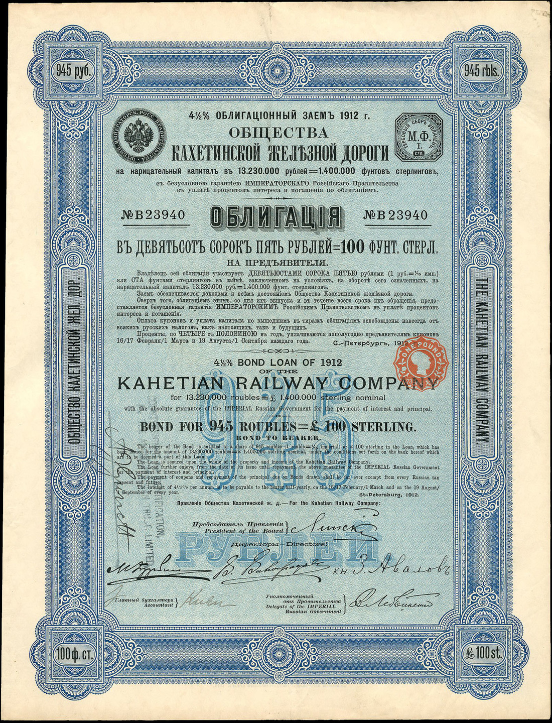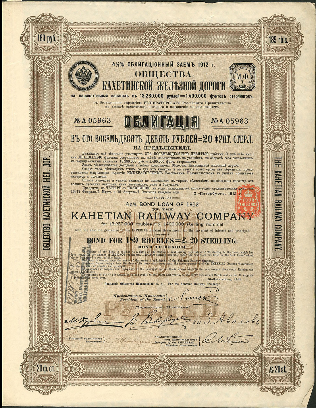 (x) Russia: Kahetian Railway Company 4½% Loan 1912, a group of 99 bonds for £20, and 80 bonds for £100, ornate borders, brown and blue respectively, with coupons, some with tears but most are very fine and extremely fine. (179)