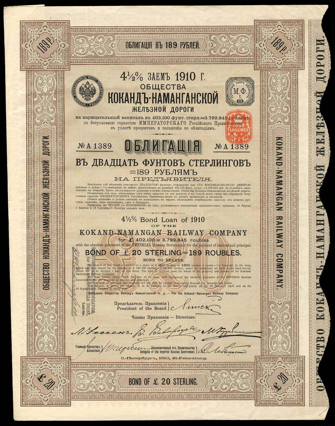 (x) Russia: Kokand-Namangan Railway Company 4½% Loan, 1910, a group of £20 bonds (67), ornate borders, brown and black with coupons, a few with edge tears but mostly very fine to extremely fine. (67)