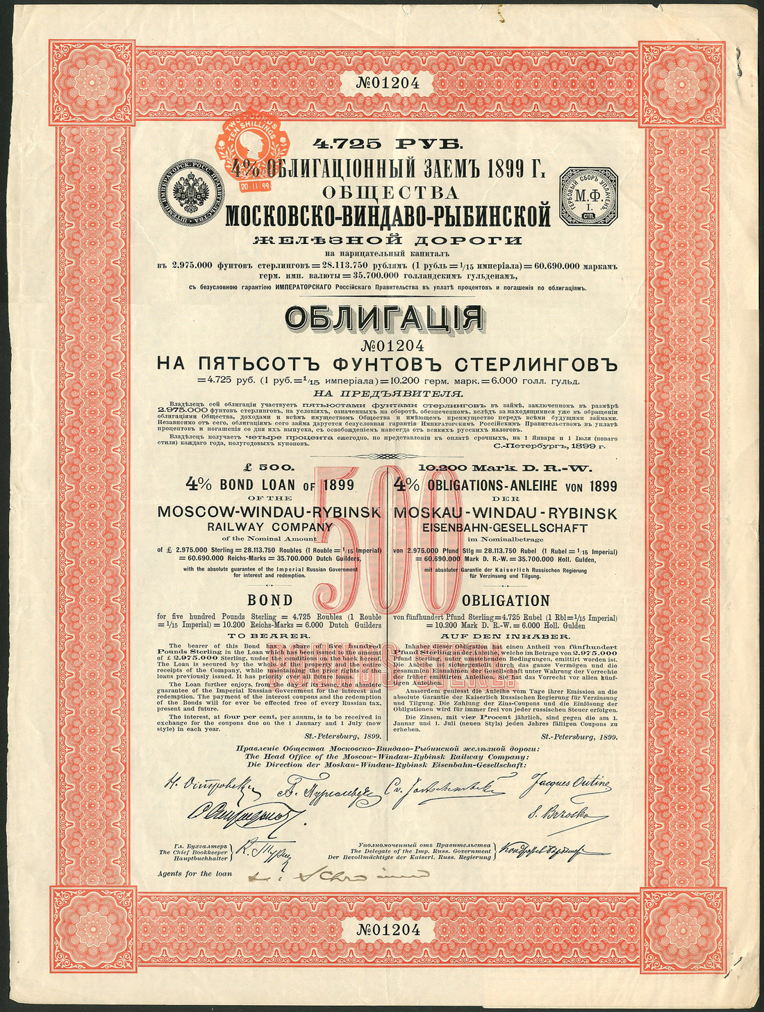 Russia: Moscow-Windau-Rybinsk Railway Company, 4% Loan of 1899, bond for £500, St. Petersburg 1899, no.1204, ornate border, red and black, together with Imperial Government of Russia, Consolidated 4% Railroad bonds, series 1 and 2, both the scarce high denomination of 3125 roubles; Moskau-Kiew-Woronesch Railway (3), Moscow 1909; Kursk-Charkow-Asow Railway, St. Petersburg 1889 (4); Russian 4½% State Loan of 1909; and City of Moscow Loan of 1908, £20, all with coupons, some with slight edge damage otherwise about very fine. (12)