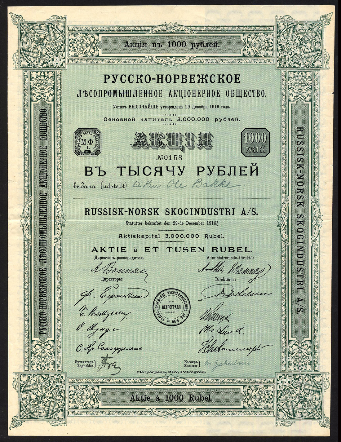 (x) Russia: Russisk-Norsk Skogindustri, 1,000 rouble share, 1916, no.0158, ornate border, black and green, text in Russian and Norwegian, with coupons, very fine.