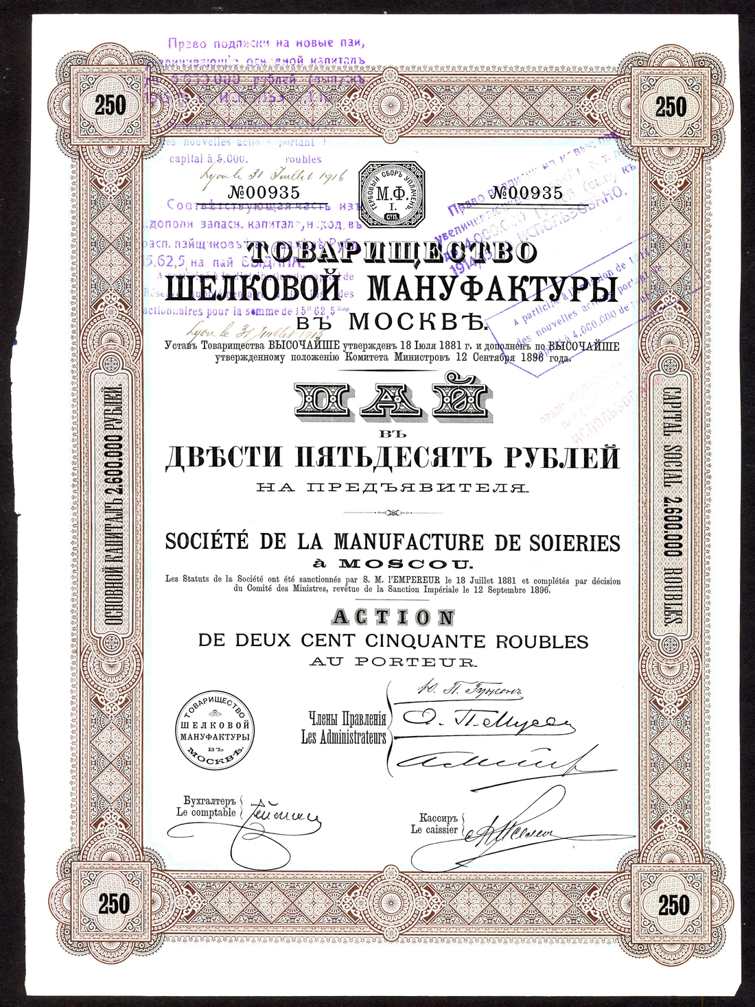 Russia: Société de la Manufacture de Soieries a Moscow, 250 rouble share, first issue 1896, no.00935, ornate border, black and brown with blue underprint, with talon, good very fine.