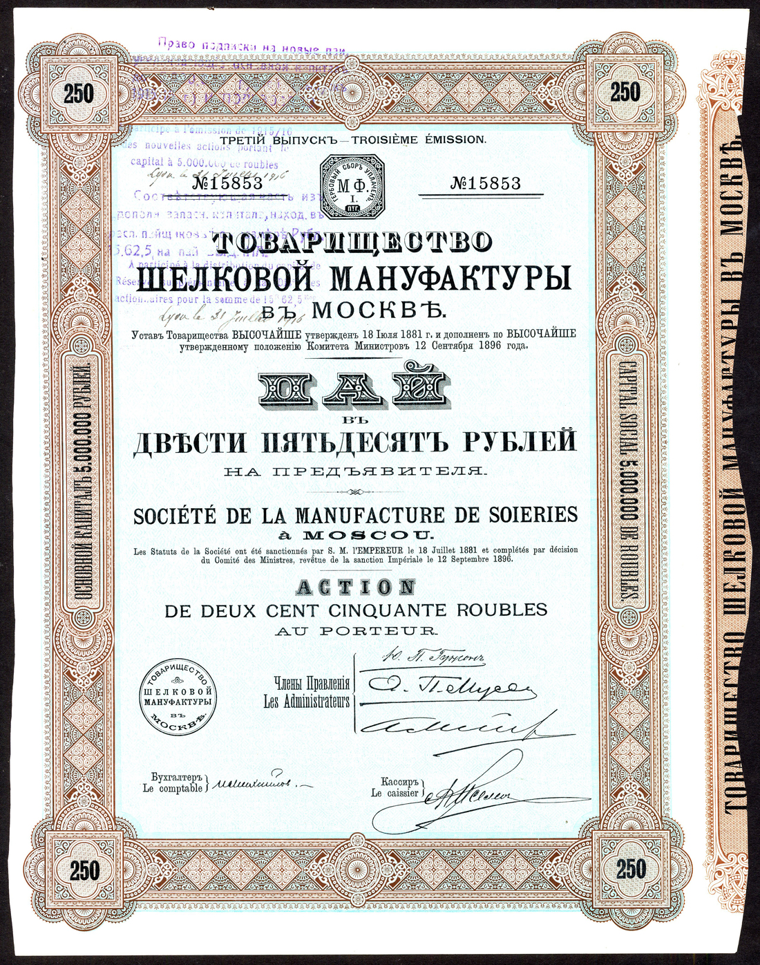 Russia: Société de la Manufacture de Soieries a Moscow, 250 rouble share, third issue 1915, no.15853, ornate border, black and brown with blue underprint, with coupons, extremely fine.