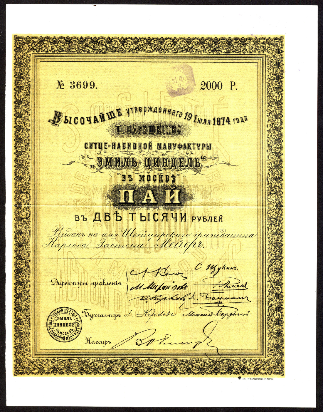 Russia: Socété de la Manufacture "Emile Zundel" a Moscou, 2000 rouble share, 1904, no.3699, ornate border, black with green underprint, with coupons, extremely fine.
