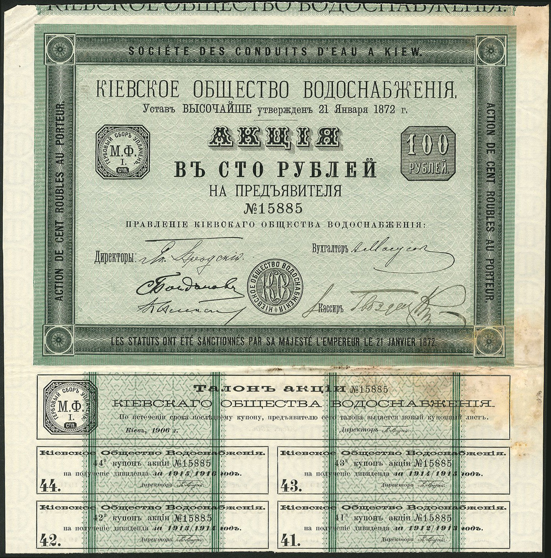 Russia: Sociéte des Conduits D'Eau a Kiew, a group of 13 certificates for 100 rouble share, Kiev 1906, ornate border, green and black, with coupons, all with damp staining at bottom right and split along fold, otherwise almost extremely fine.