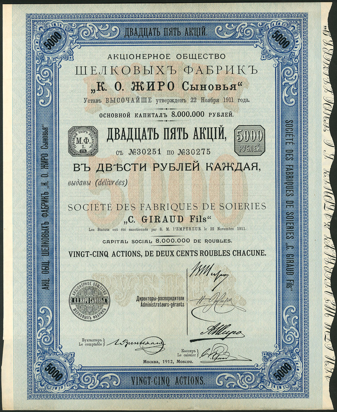 Russia: Societé des Fabriques de Soieries "C. Giraud Fils", 25 shares of 200 roubles, Moscow 1912, no.30251-30275, ornate border, blue with pink and pale blue underprint, with coupons, good very fine and scarce.