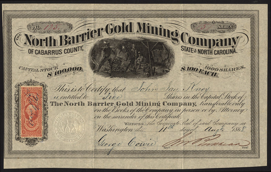 United States of America: North Barrier Gold Mining Co., Cabarrus County (NC), $100 shares, Washington 186[8], no.125, vignette beneath title of workers in mine shaft, ornate border, black, good very fine.