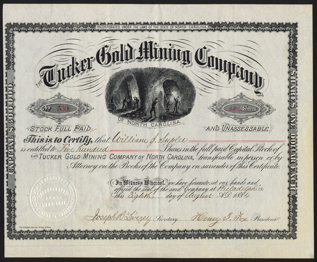 United States of America: Tucker Gold Mining Co. (NC), certificate for $1 shares, Philadelphia 188[4], no.530, vignette of workers in mine caves beneath title, ornate border, black, pin holes top left, otherwise good very fine.