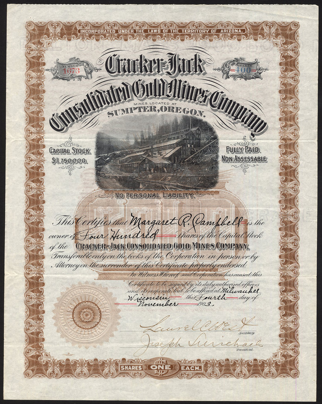 United States of America: Oregon; Cracker=Jack Consolidated Gold Mines Co. (AZ Terr), $1 shares, Milwaukee 190[3], no.1673, unusual piece in portrait format, photographic vignette of mine buildings in centre, brown and black, very fine and scarce.