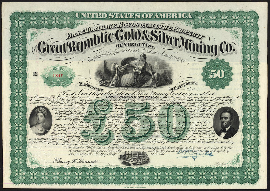 United States of America: Great Republic Gold and Silver Mining Co. (VA), 7% first mortgage bond for £50, 1867, no.1849, attractive piece with 'Liberty' and American eagle below title, Queen Victoria to left, Abraham Lincoln to right and smelting machines at bottom, ornate border, printed by the Continental Banknote Co., green and black, with coupons, extremely fine.