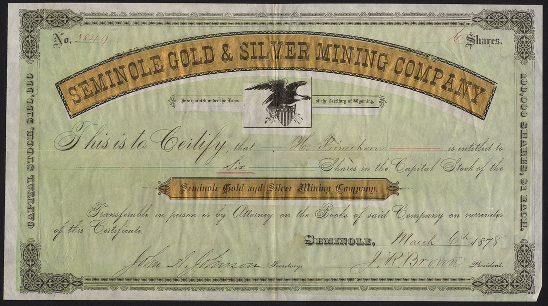 United States of America: Seminole Gold & Silver Mining Co. (Wyoming Territory), $1 shares, Seminole 187[8], no.2849, American eagle below title, ornate border, black and gold with pale green underprint, very fine.